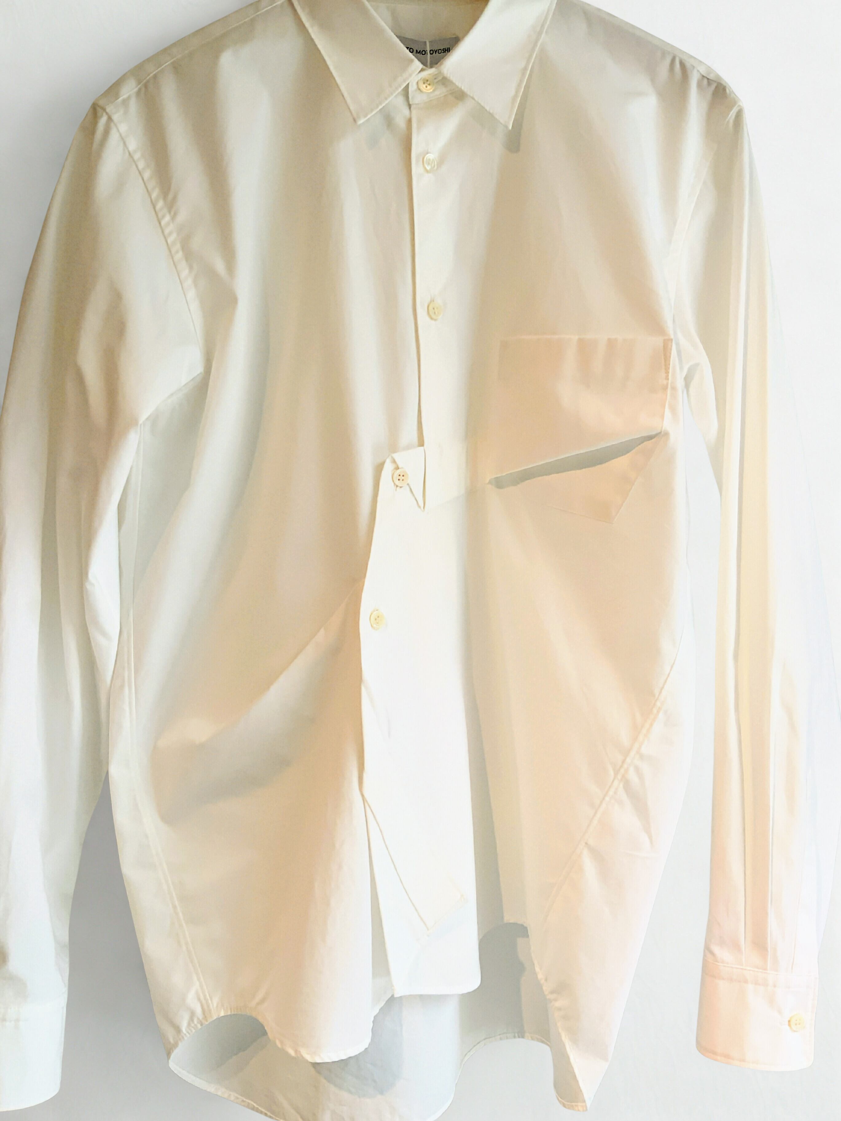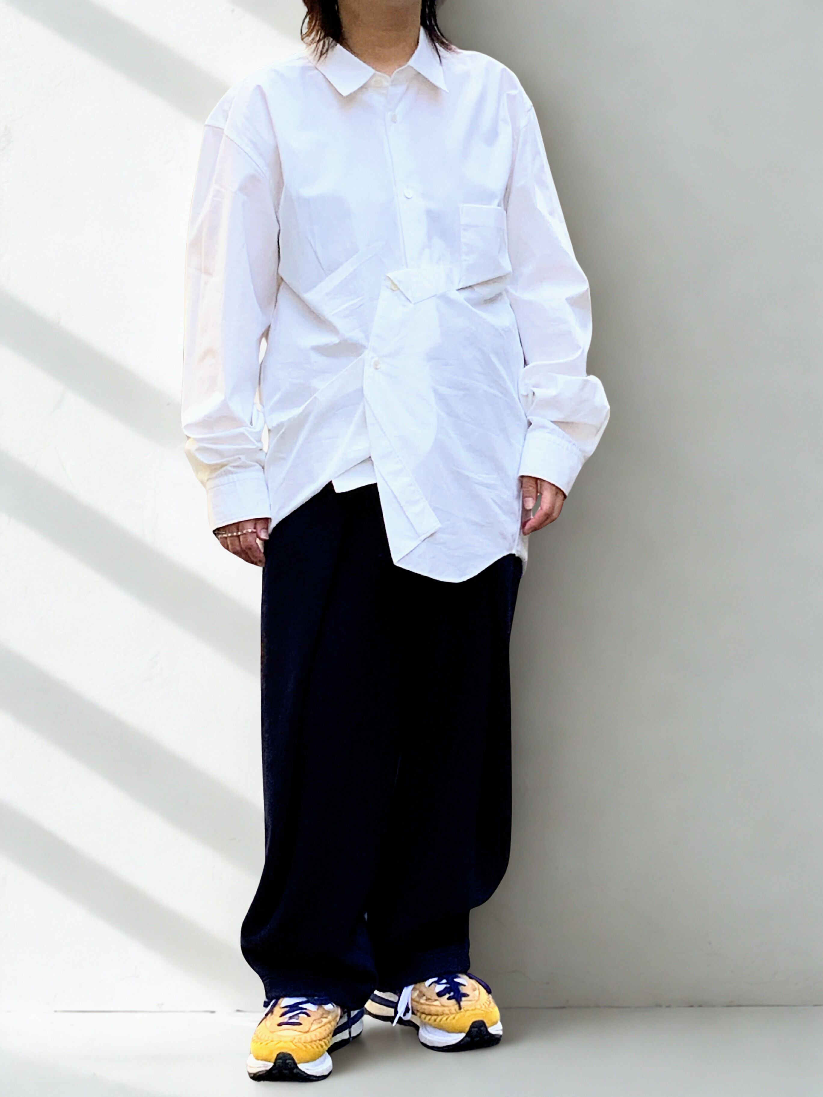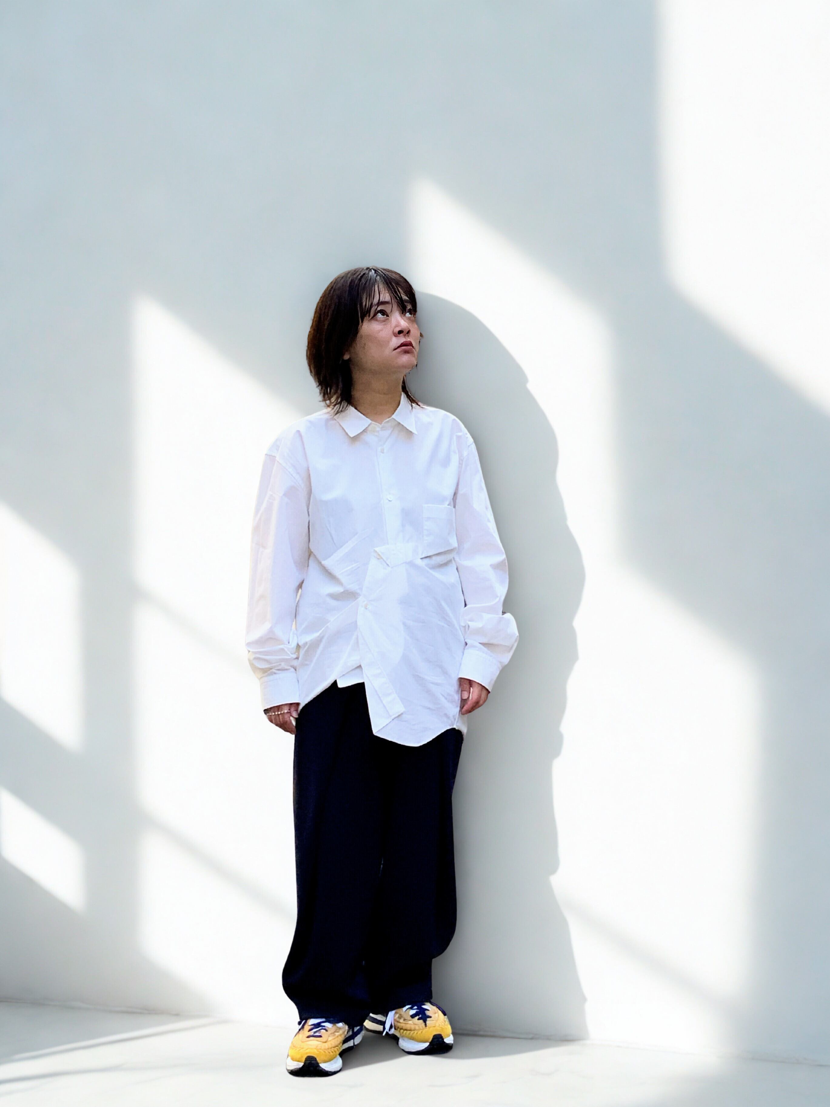 "高密度に織り上げたコットン100%の生地にピーチスキン加工を施し、しなやかな風合いと上品なマット感を持たせたレギュラーシャツ。 タックを入れながらもシルエットが美しく収まるよう設計しており、前裾はややショート丈に仕上げ、コンパクトな印象に仕上げています。 立体的なタックがアクセントとなり、デザイン性も兼ね備え、さまざまなスタイリングに馴染む一着です。"