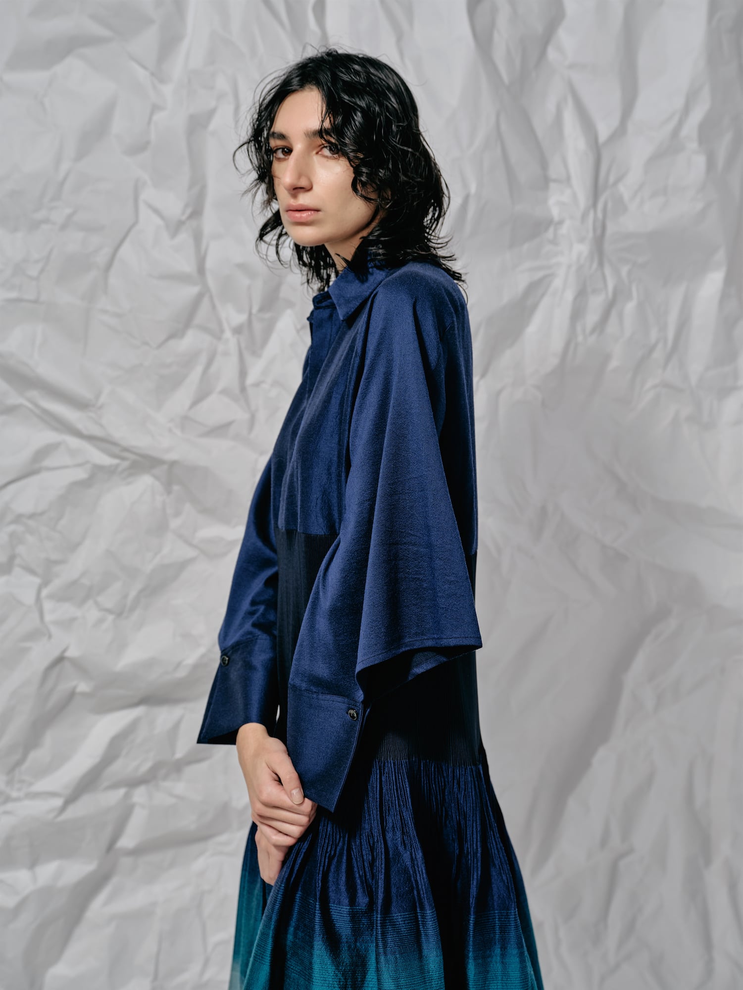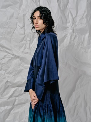 この生地は、桐生の老舗の機屋で織り上げられたもので、シャーリング部分とウールのフラット部分という異なる2つの表情を持ち、それぞれの質感が絶妙に混在しています。