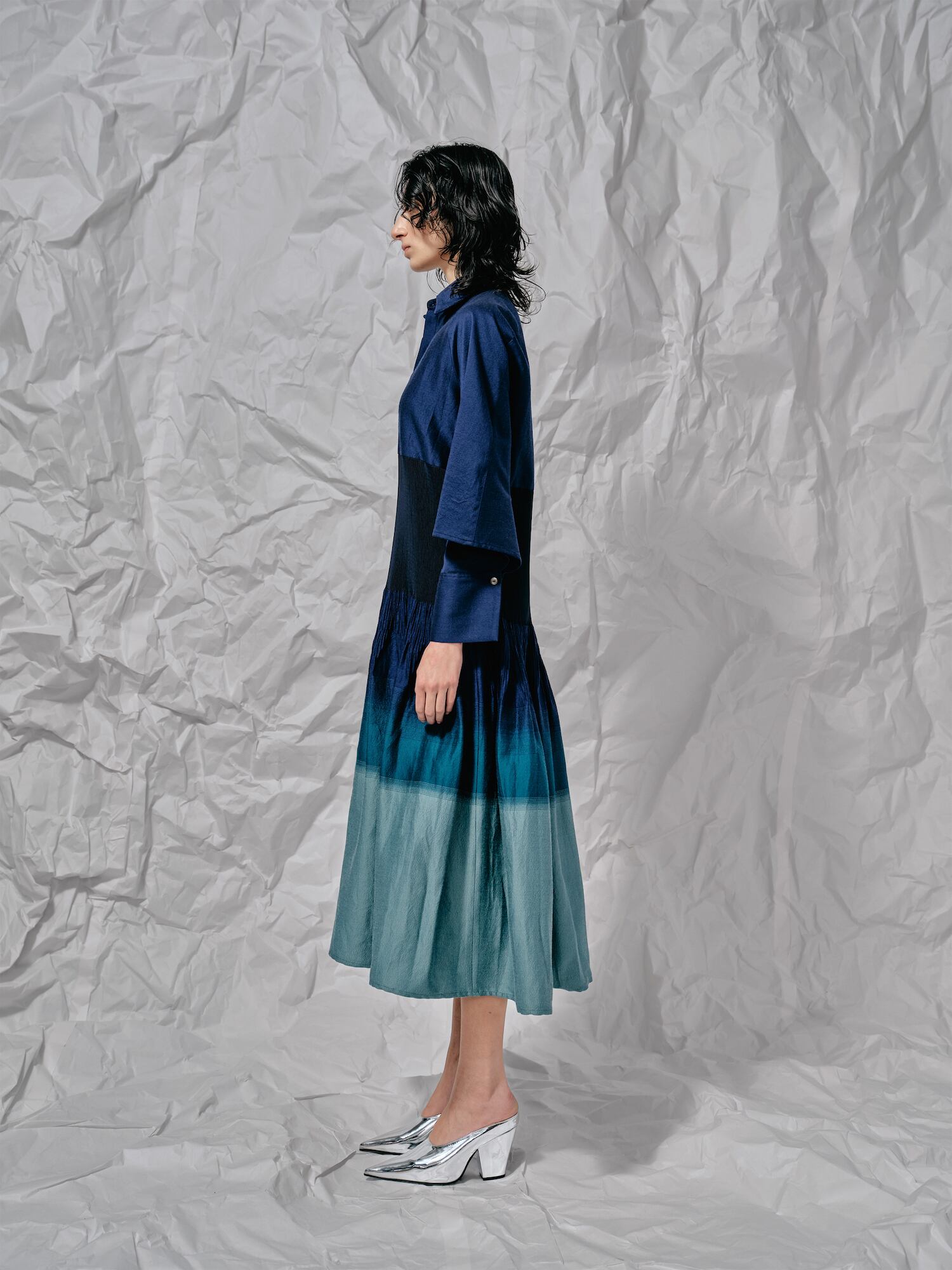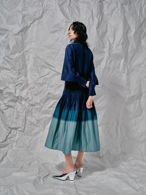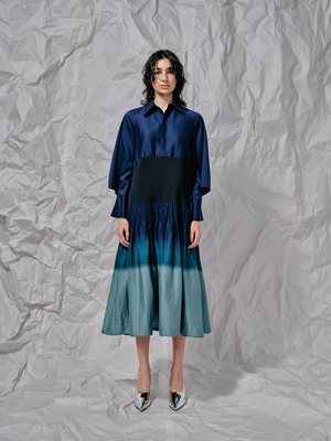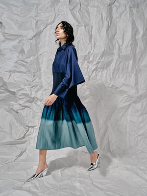 トップス部分にはシャープなデザインのシャツディテールを取り入れ、ウエスト部分のギャザーが立体感を演出。