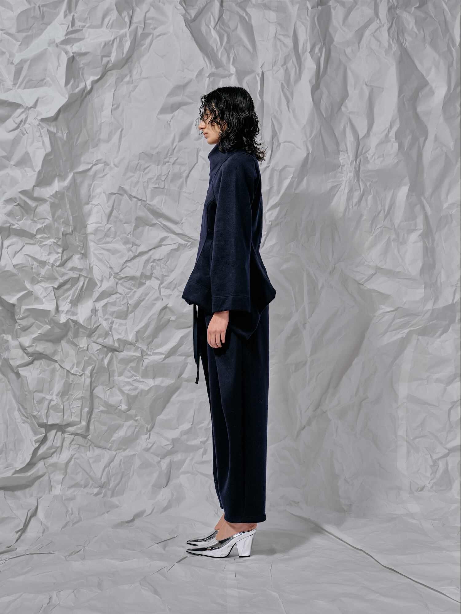 大きなタックが施されたデザインにより、ウエストから膝にかけてはゆったりと広がり、裾に向かって絞られるテーパードシルエットが特徴のパンツです。