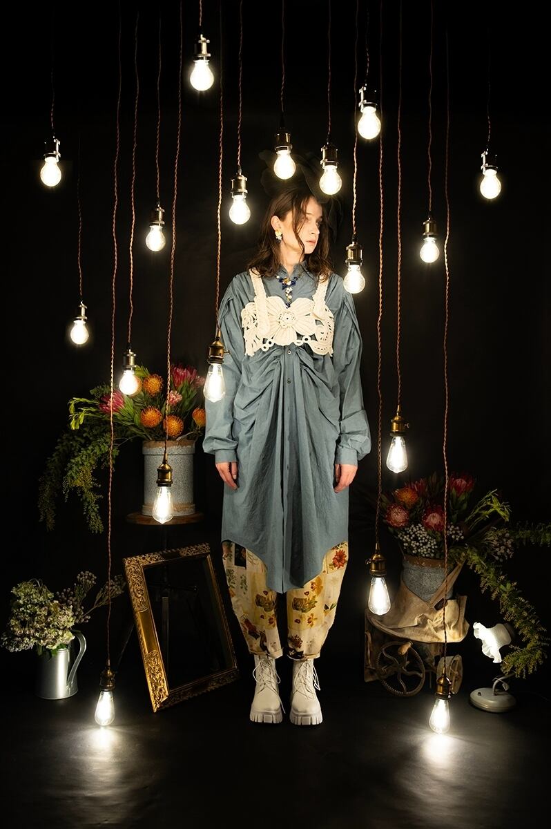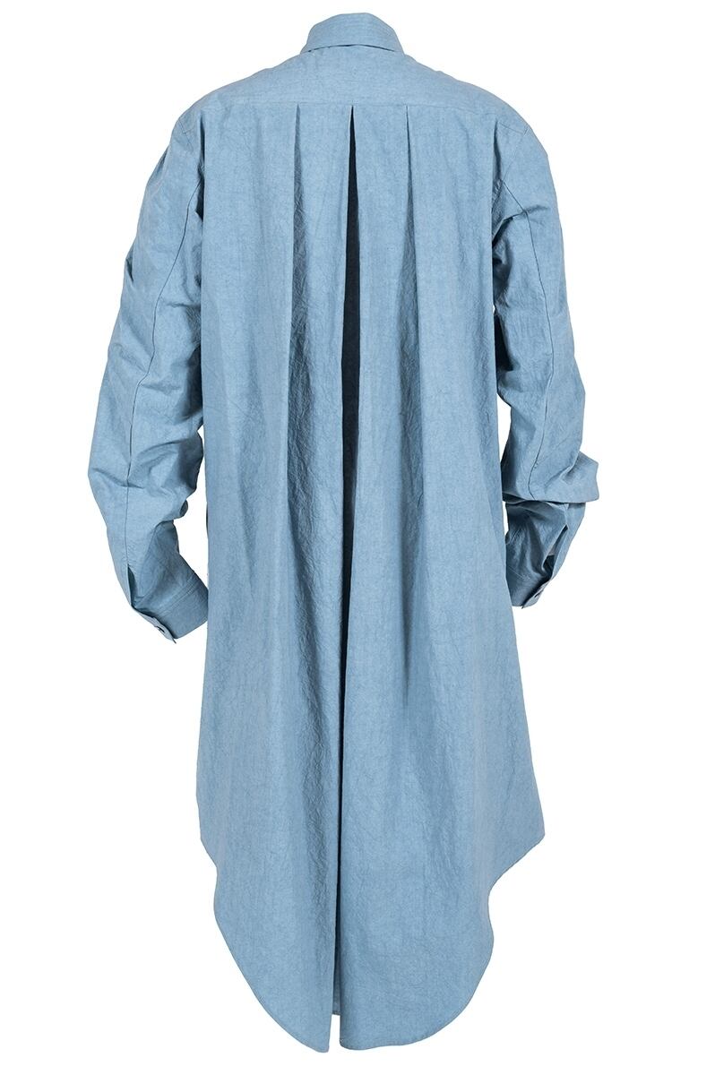 ウエスト中央に向かってギャザーが施され、ドレープが体全体を沿うようにデザインされたシャツワンピース