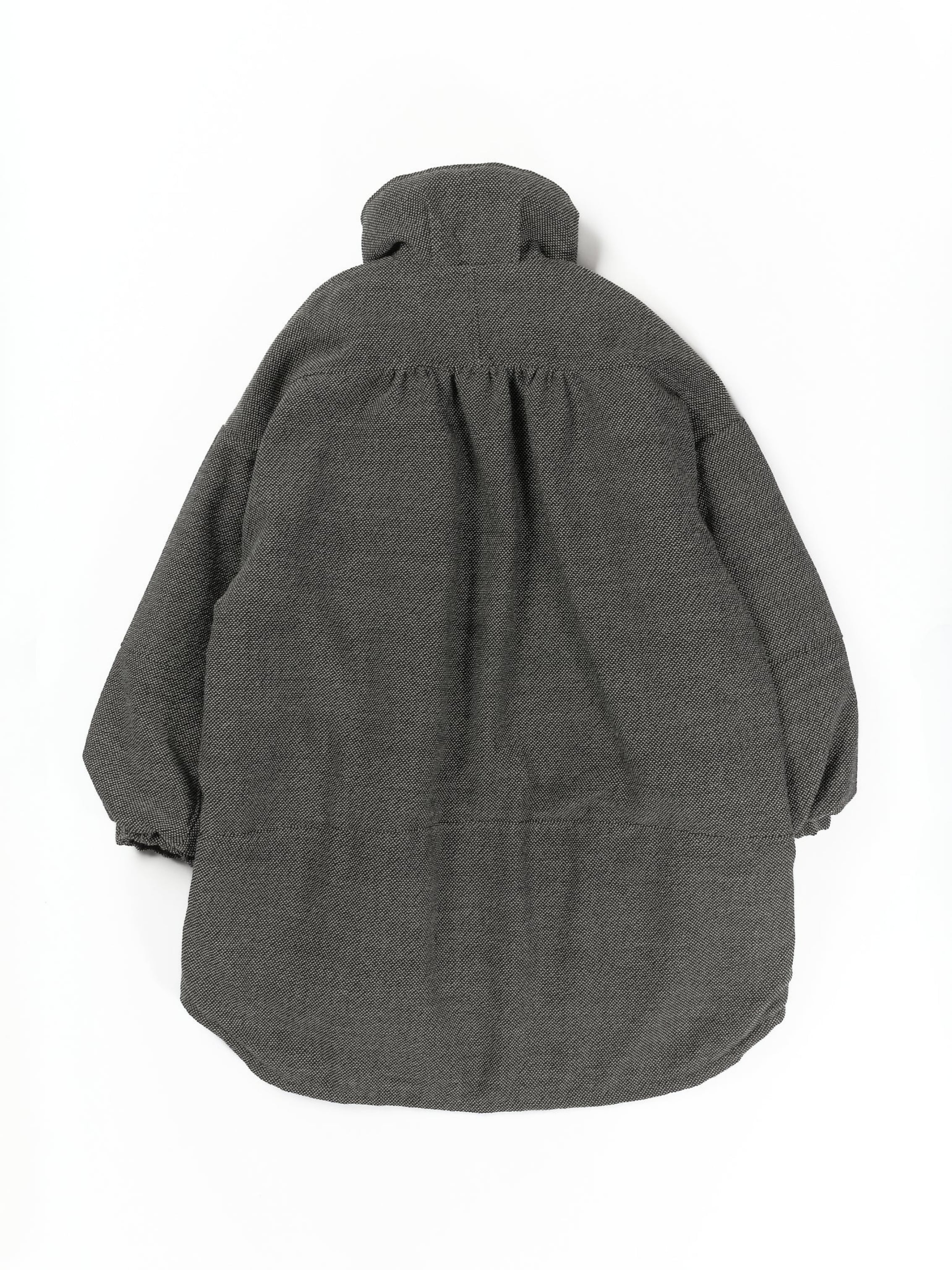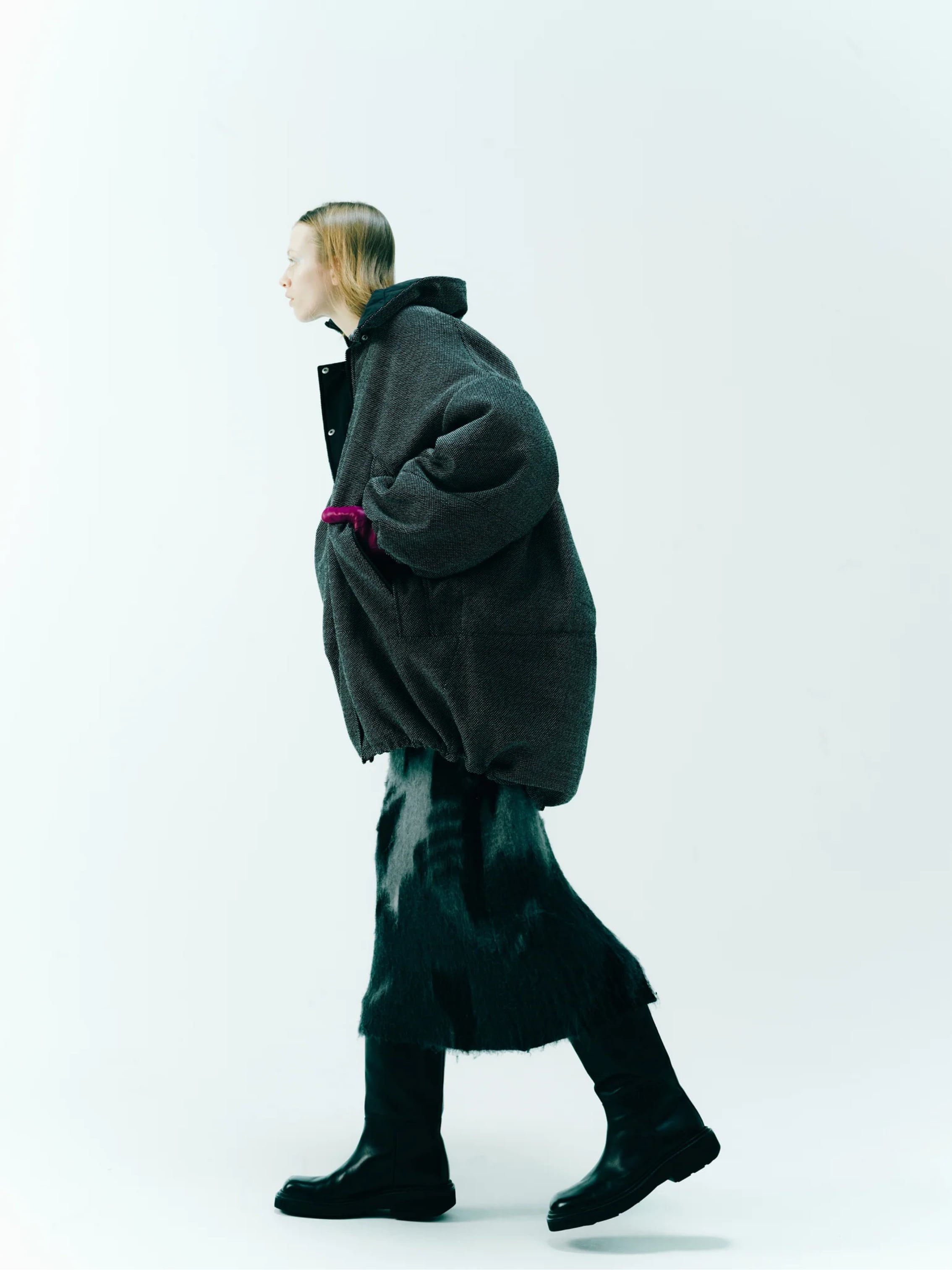 US ARMYのPCU LEVEL7モンスターパーカーをデザインに落とし込み、表情豊かなウール混紡ツイードを使用して高級感のあるオーバーコートに仕上げました。
