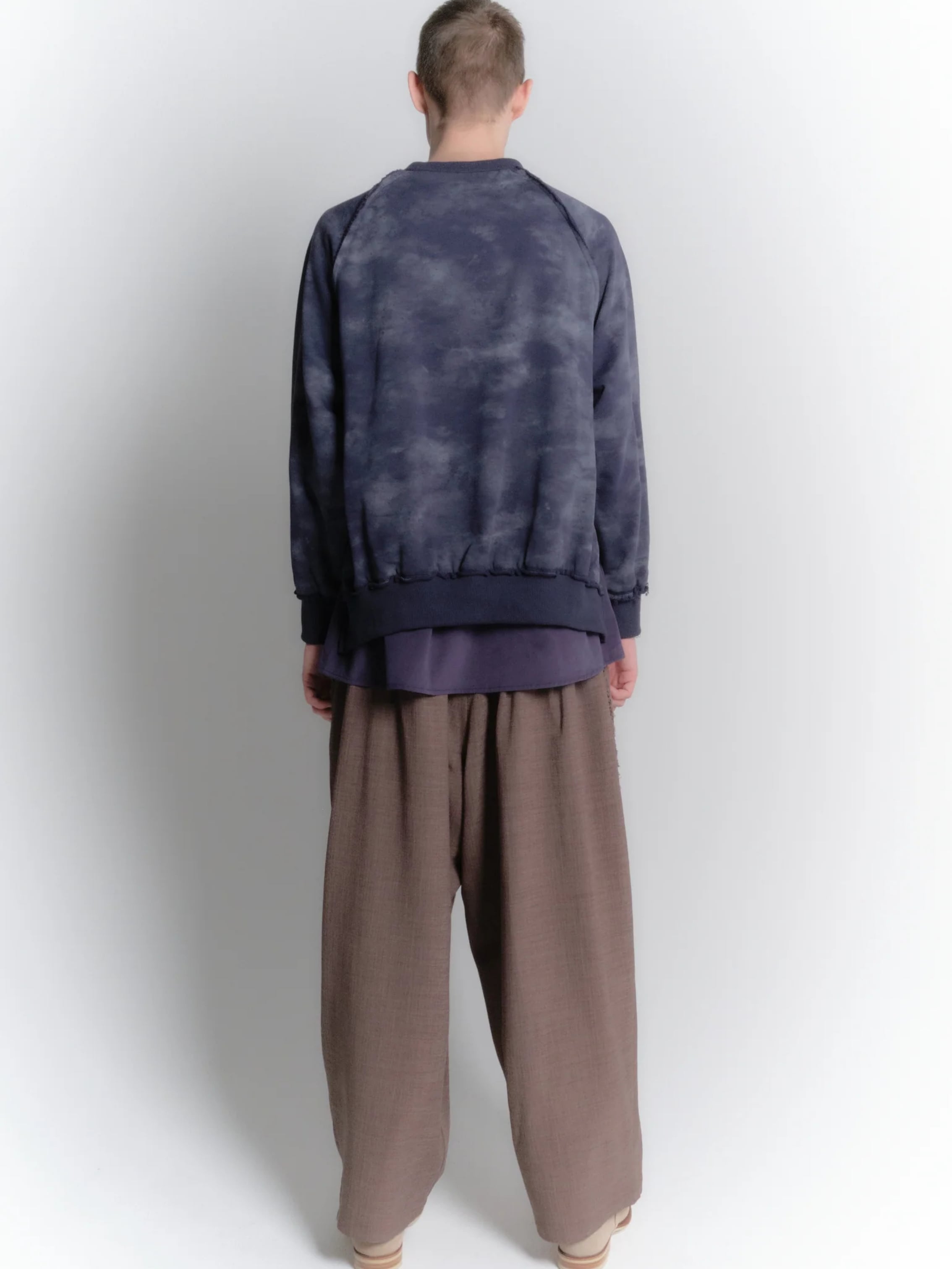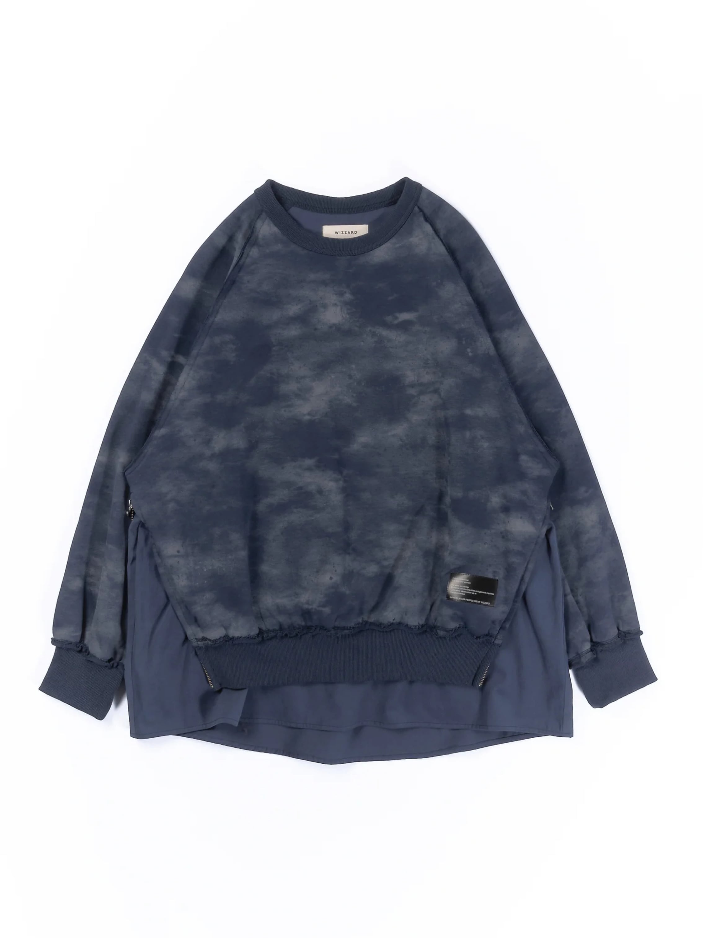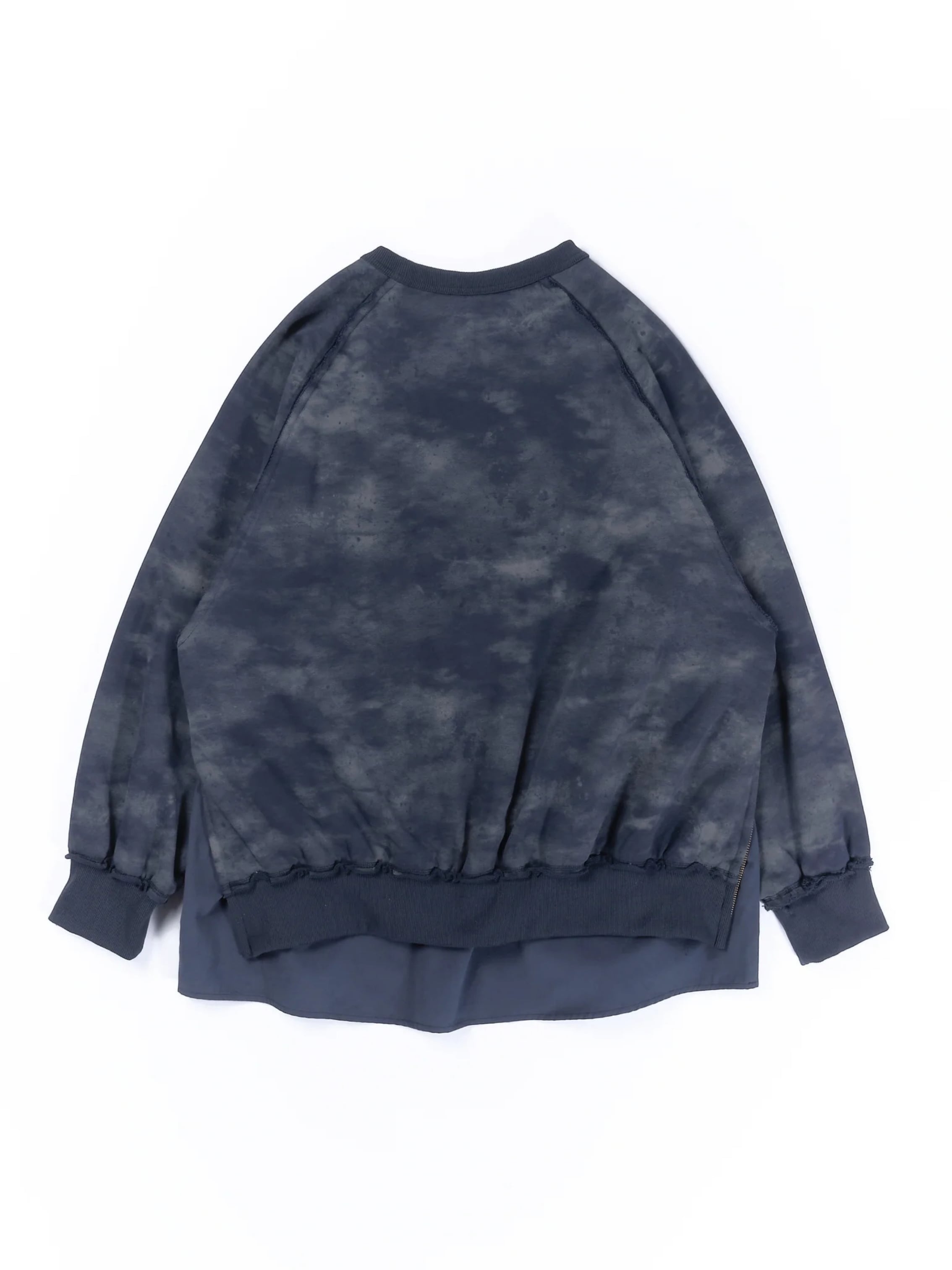 フェード加工を施した裏毛と、起毛感のあるコットンツイル素材を裾からレイヤードさせたクルーネックスウェットシャツ。