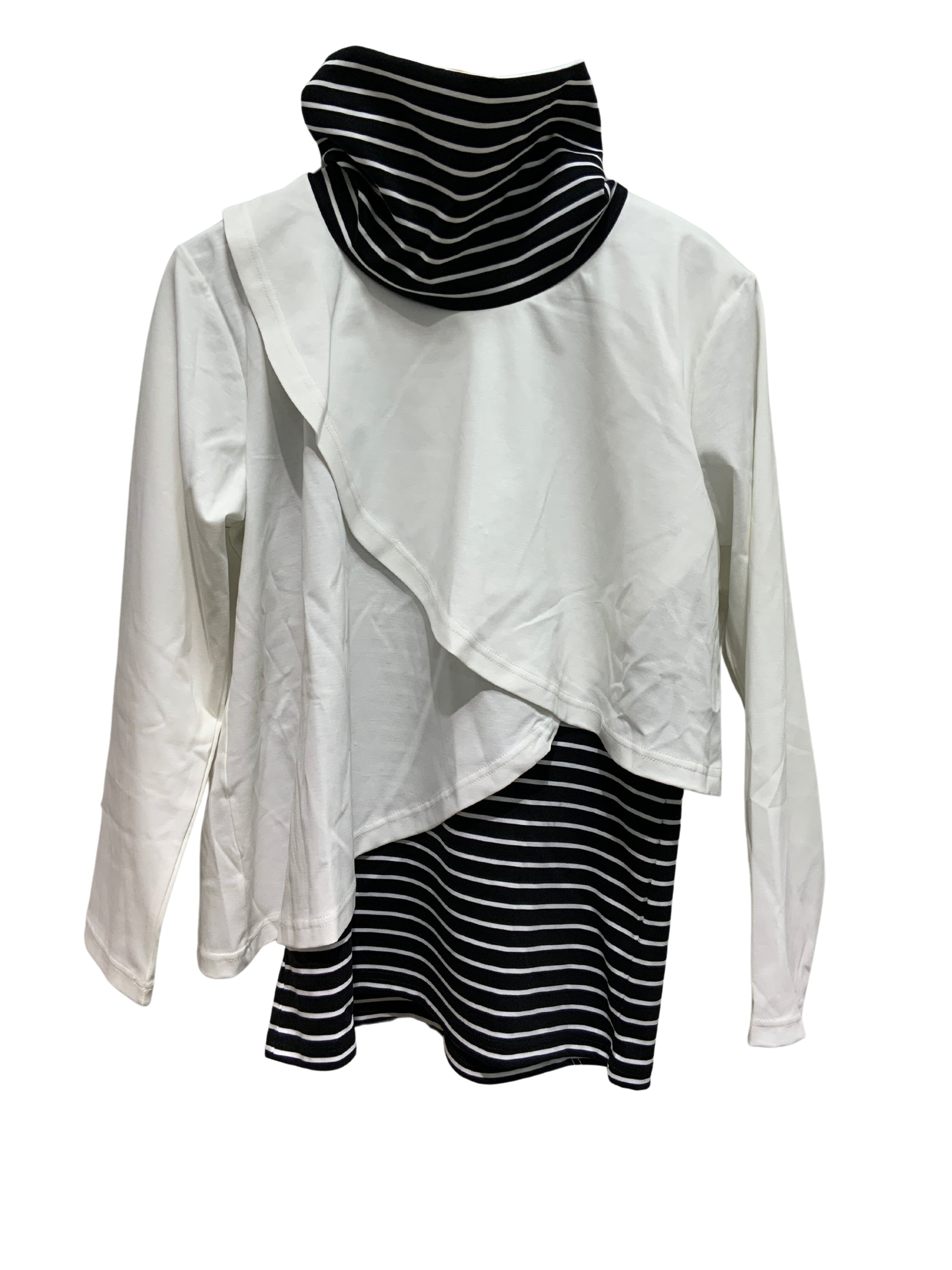 身頃は2重になっていますが、袖は1枚なのでジャケット・カーディガンなどを上にきても嵩張らないようになっています。