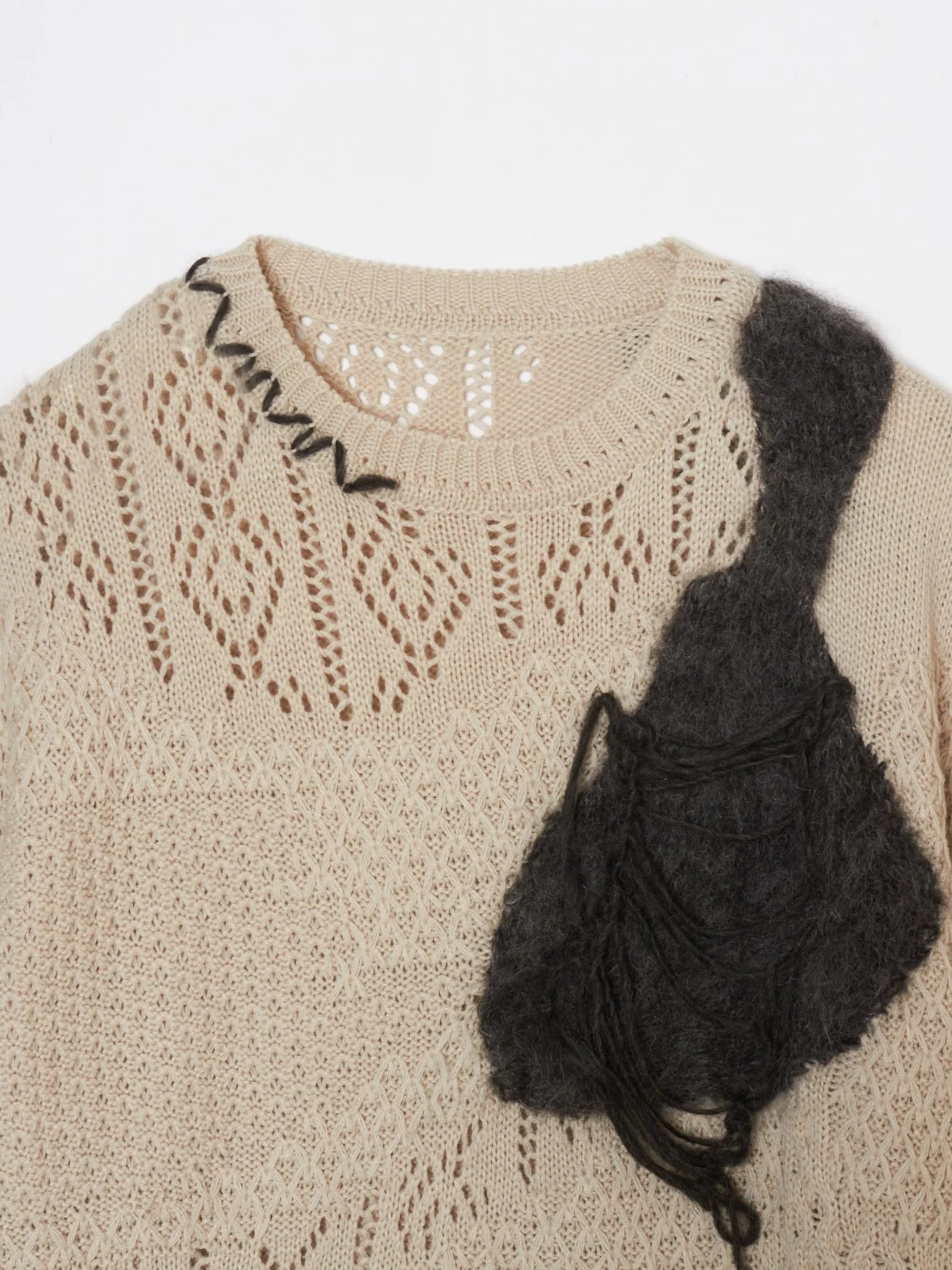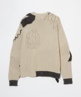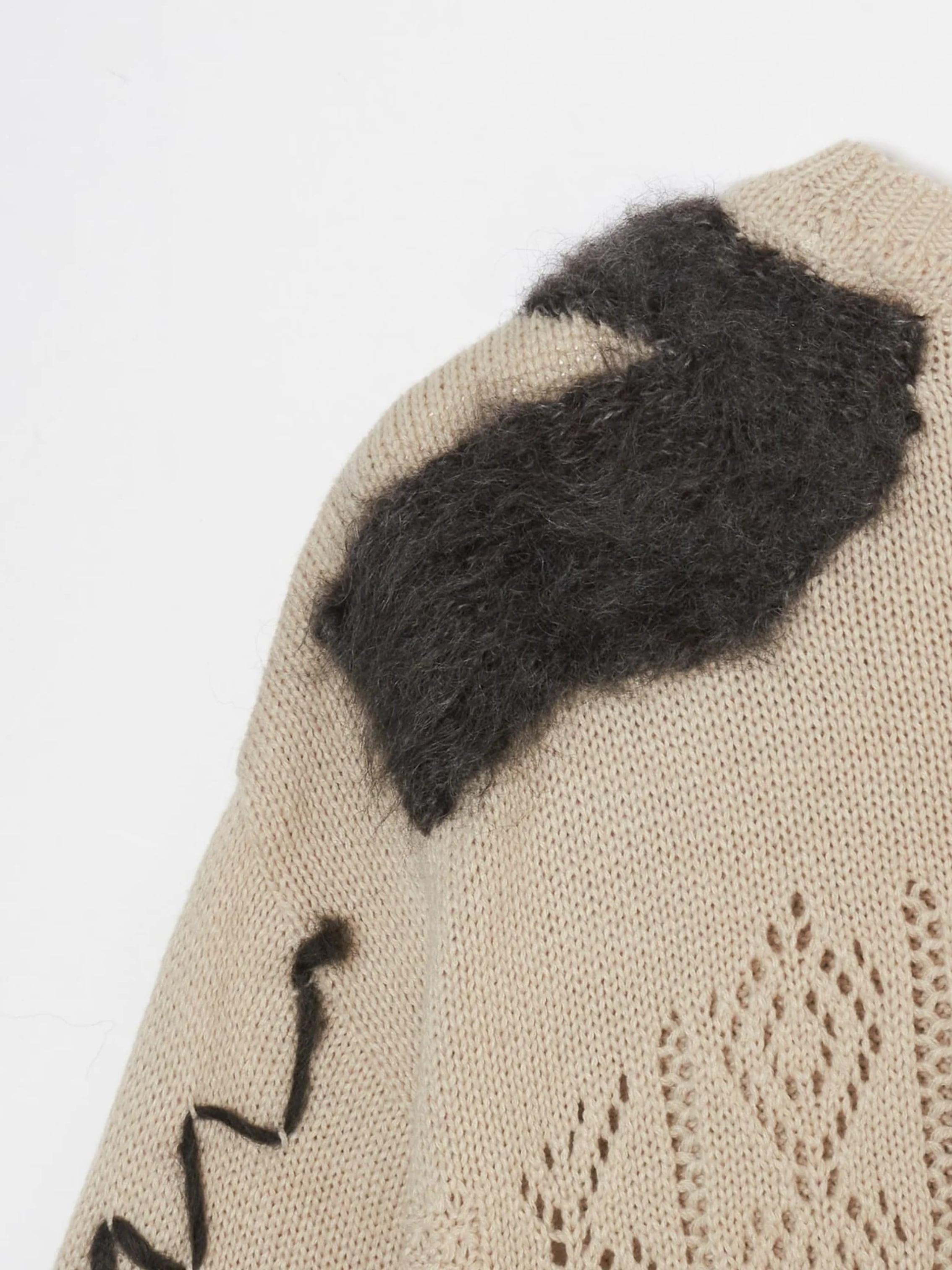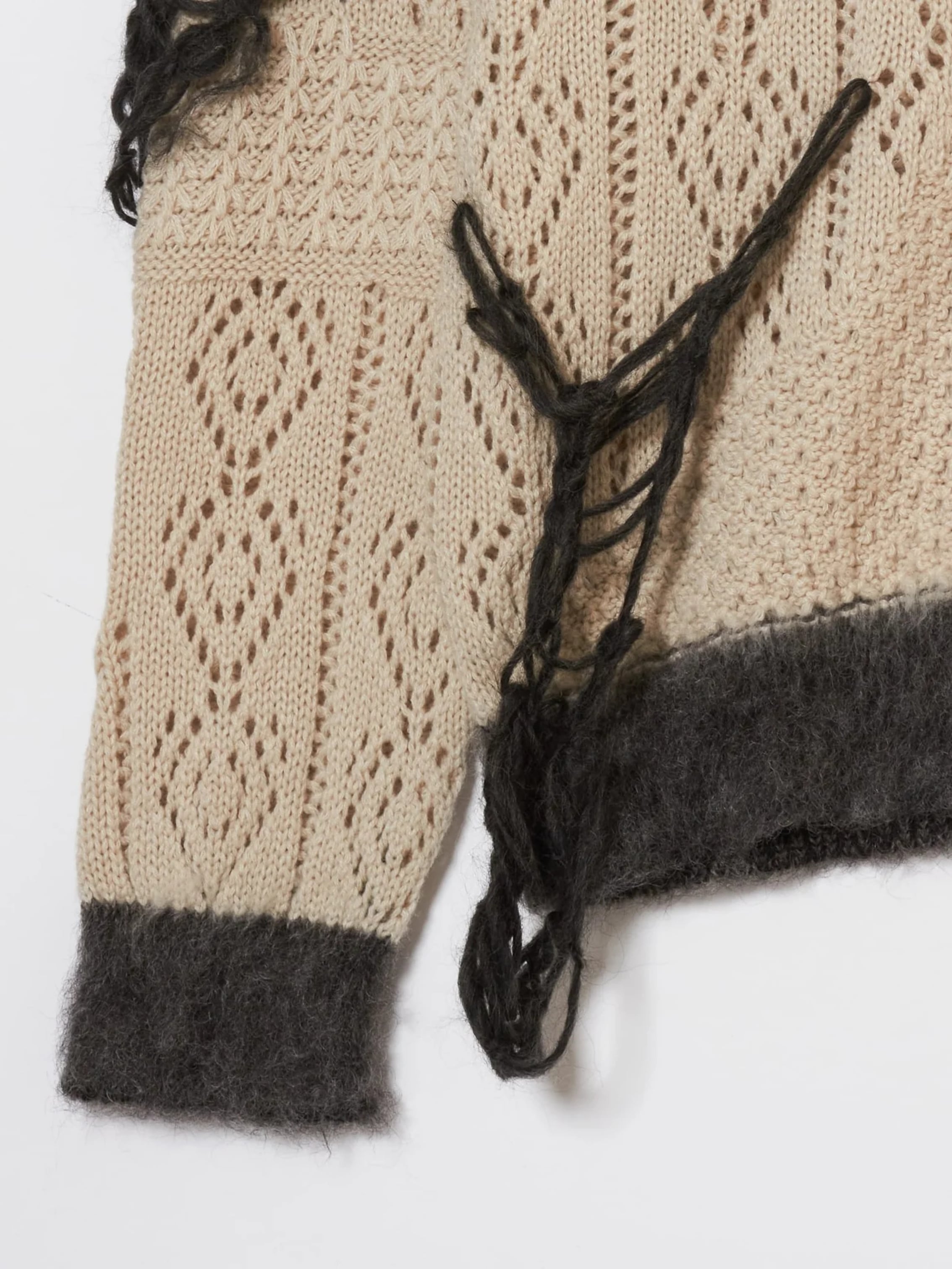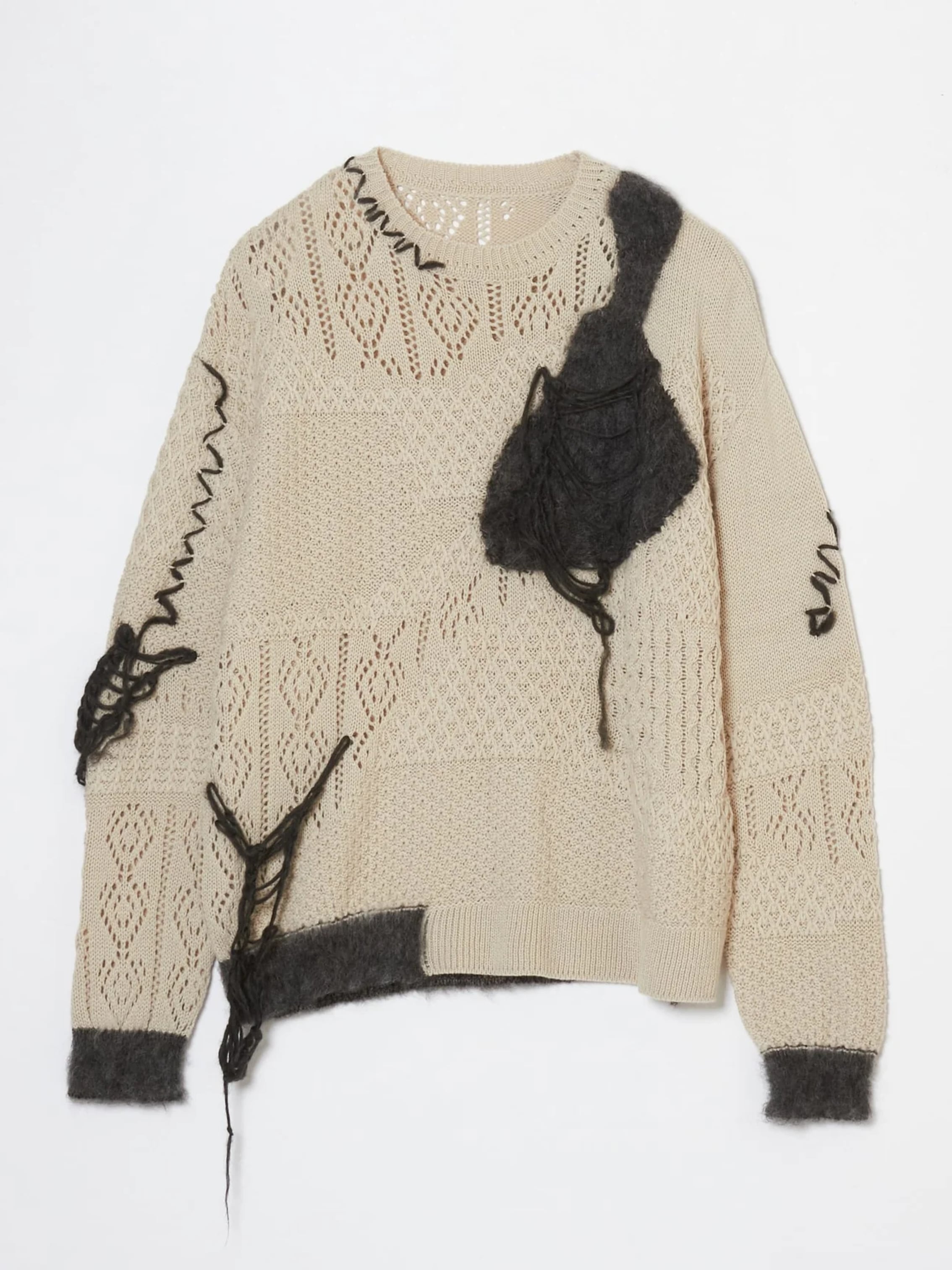 数種類の網地を組み合わせ複雑で膨らみのある質感に仕上げ胸元の部分はモヘアで表情豊かにしています。製品後、さらに手編みをしたパーツをアクセントとして加えデザインポイントとなっています。