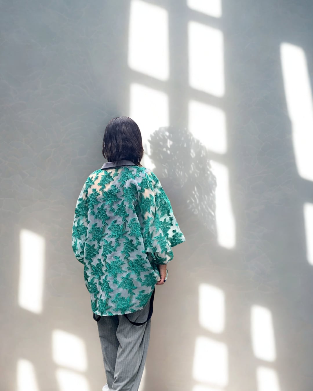 タテ糸、ヨコ糸共に極細のナイロンを使用したカットジャカード。グランド部分は織り組織と加工により軽くて柔らかく強度もあるメッシュ生地。メッシュ部分のブランドにポリエステル2色を使い花柄をカットジャカードで表現。花柄の糸の毛足の長さを調整することにより、モチーフ全体の輪郭を少しぼかし抽象的に花柄を表現。洗い加工行うことによりモチーフに立体感を与えたスキッパーデザイン。