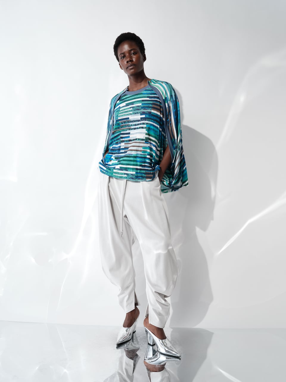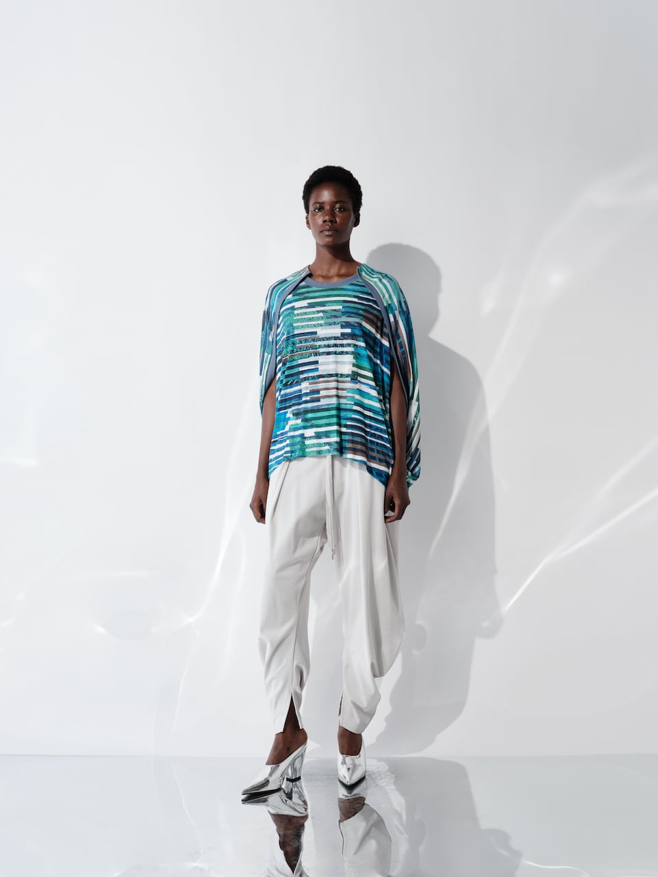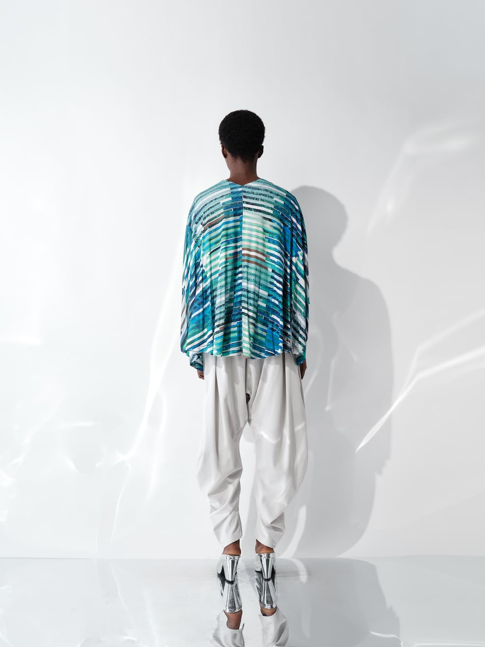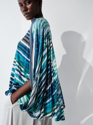 複数のイメージを短冊状に切り取り、断片的に再構成したコラージュプリントは、視覚的なリズムと奥行きを生み出し、動きに合わせて多様な表情を見せます。