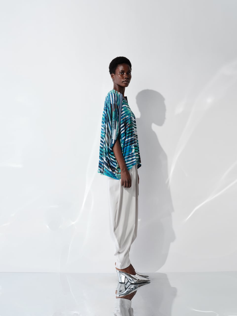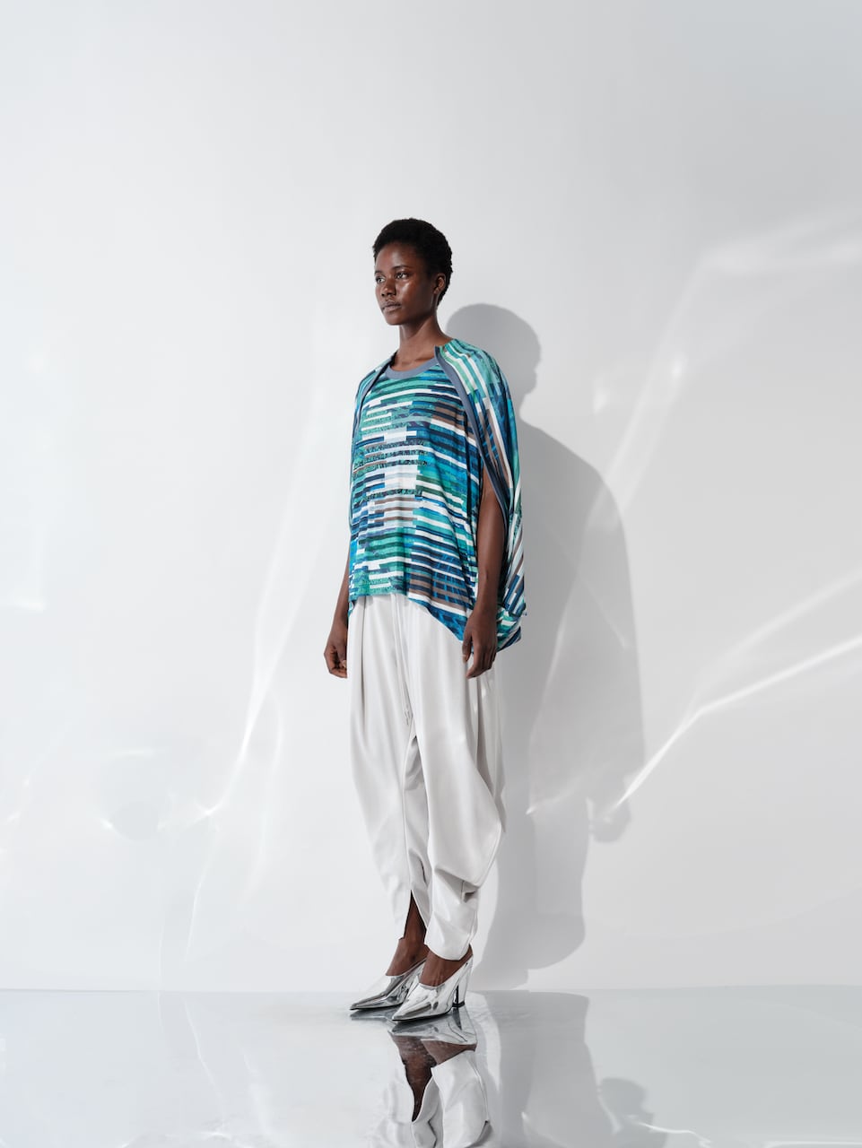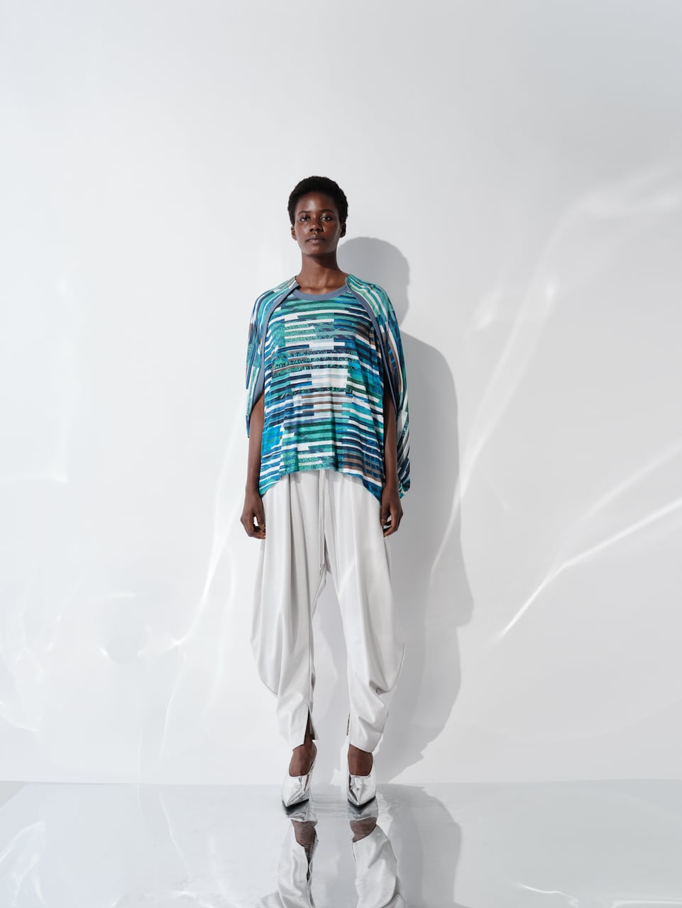 複数のイメージを短冊状に切り取り、断片的に再構成したコラージュプリントは、視覚的なリズムと奥行きを生み出し、動きに合わせて多様な表情を見せます。