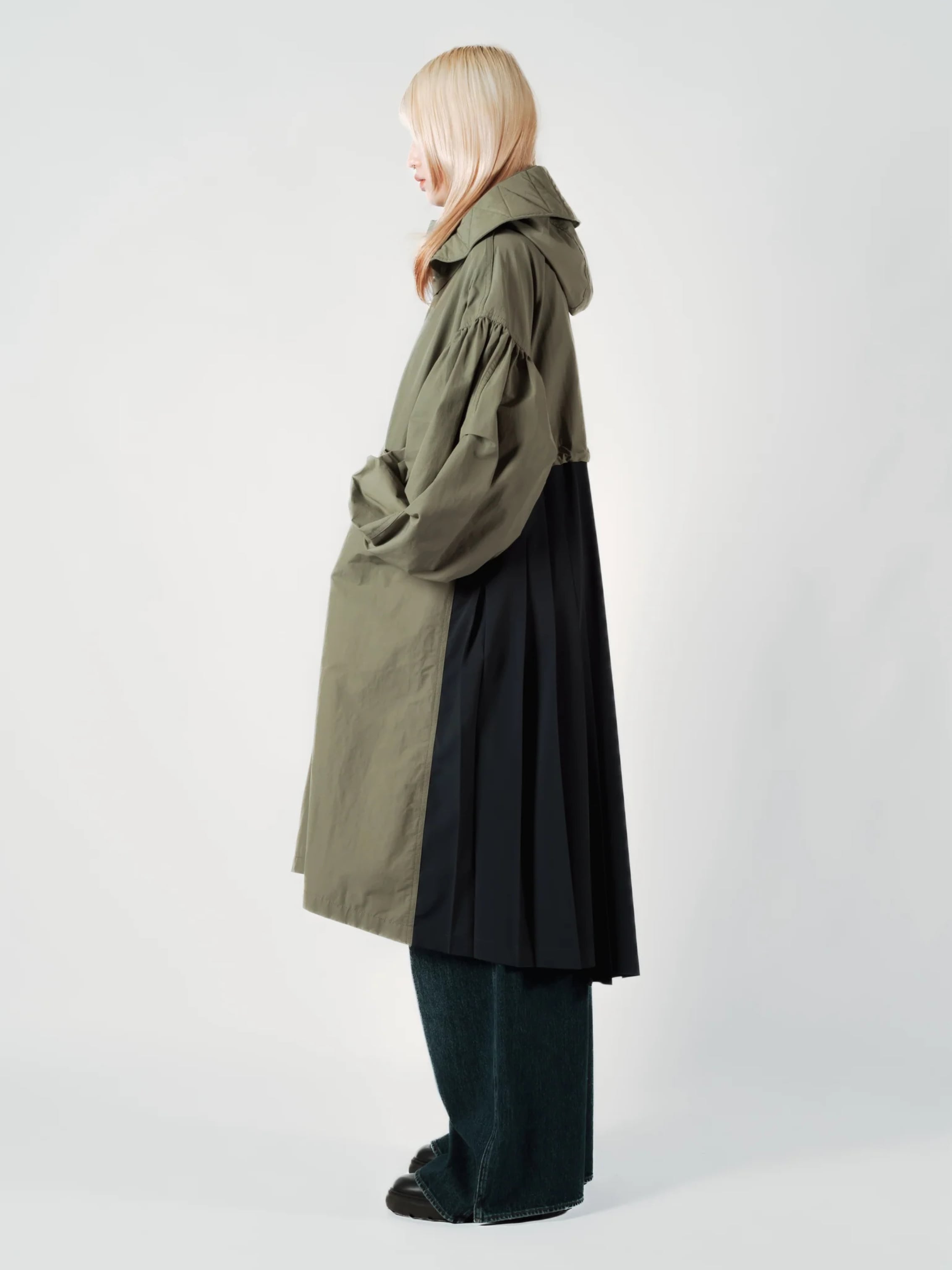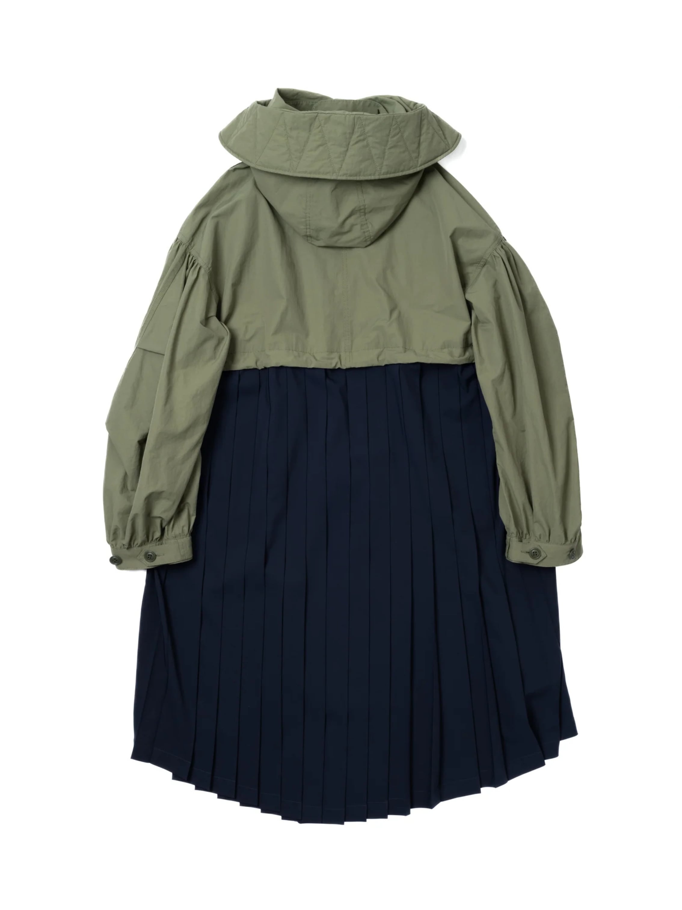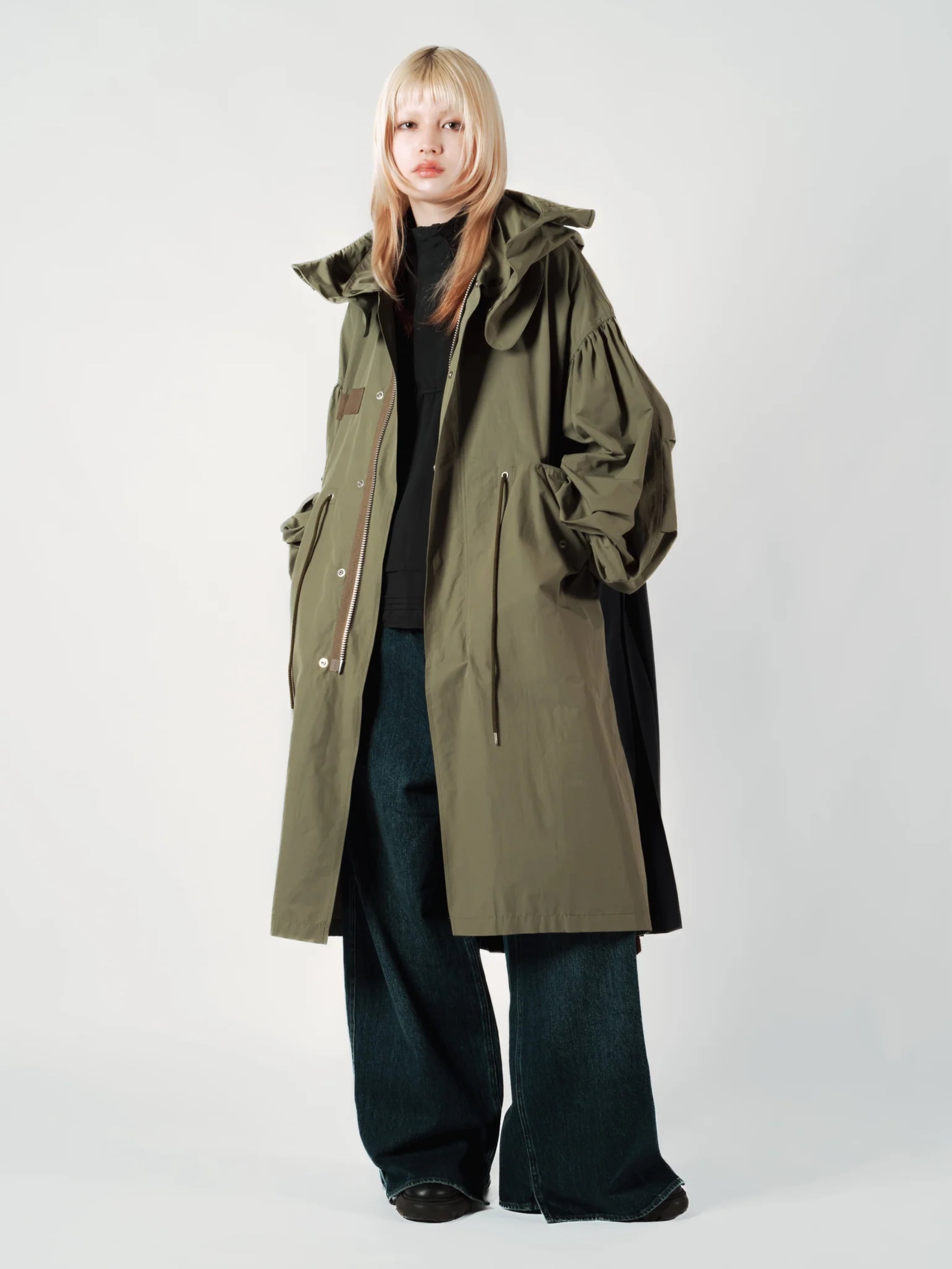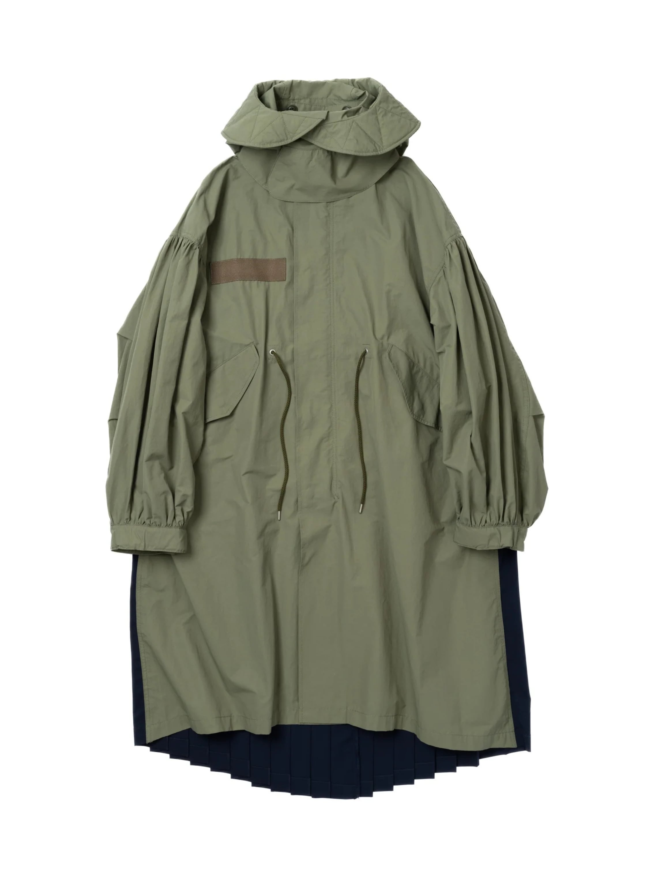 ボリュームのあるフードが特徴的なM-65タイプのモッズコートにファンクションと装飾性を兼ね備えたプリーツをドッキングしました。