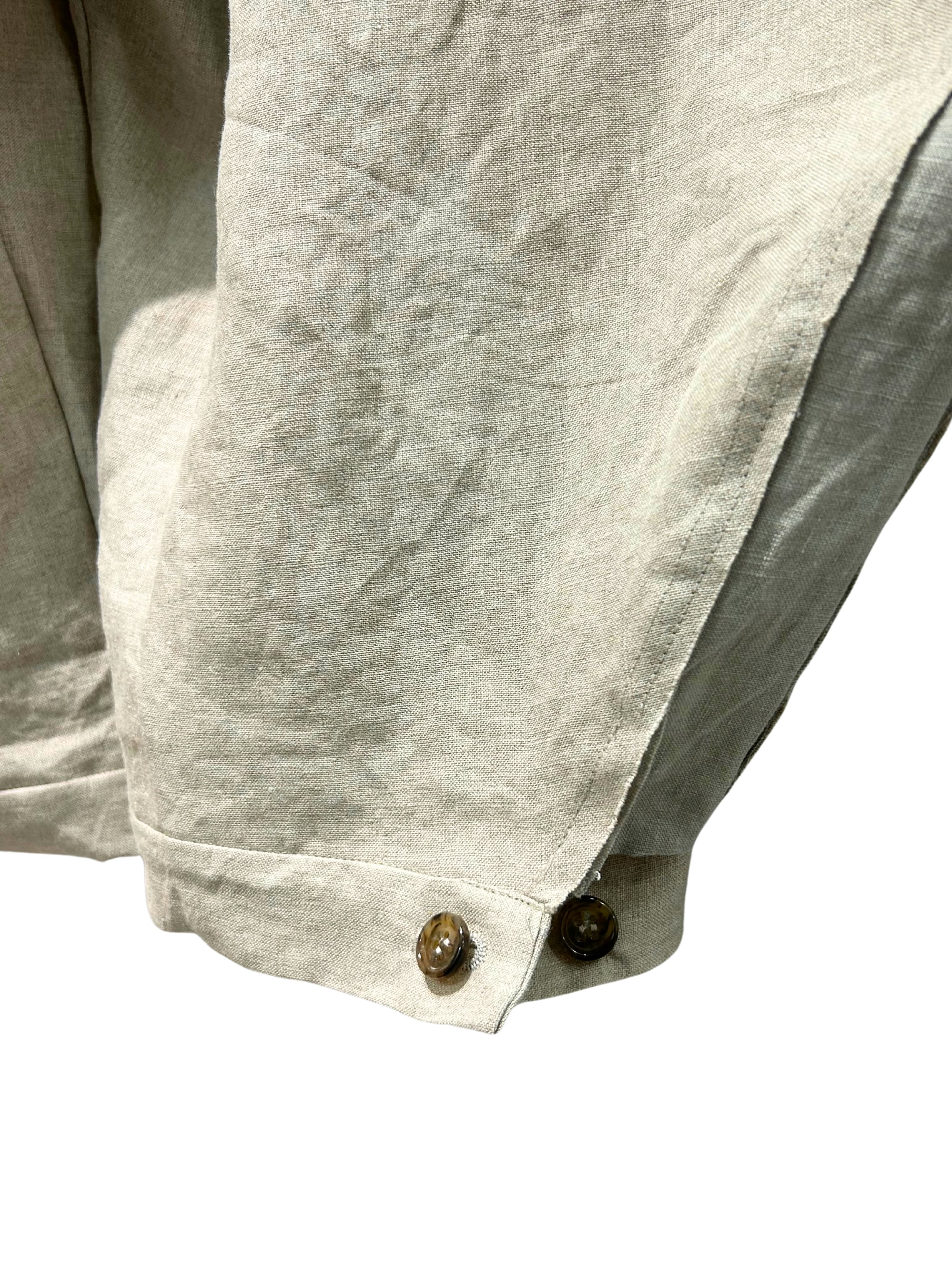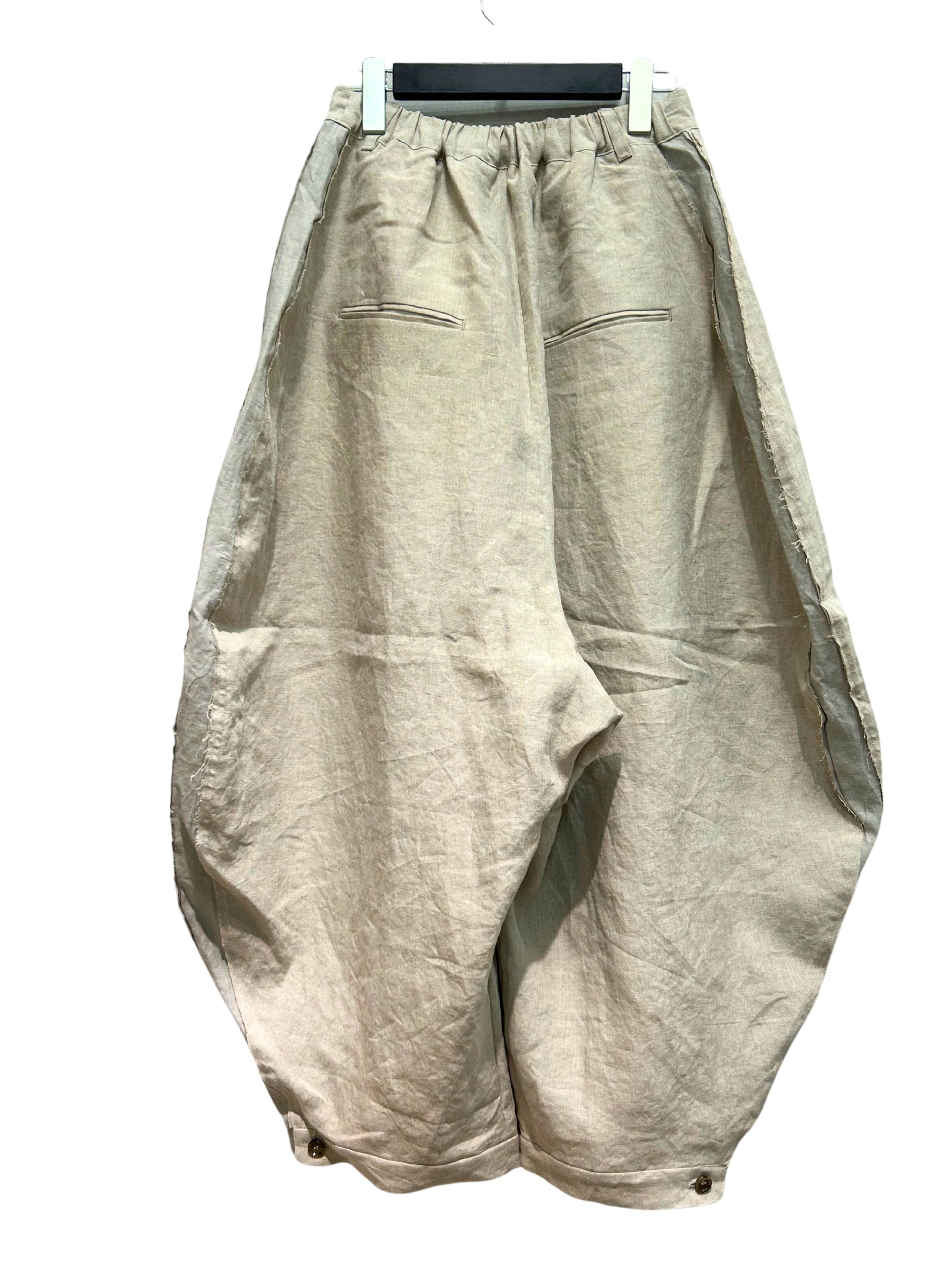 リネンを棒のようなもので叩いて、その後手でシワ加工を施して柔らかく、肌触り良くしたリネン生地をたっぷり使ったワイドパンツ。