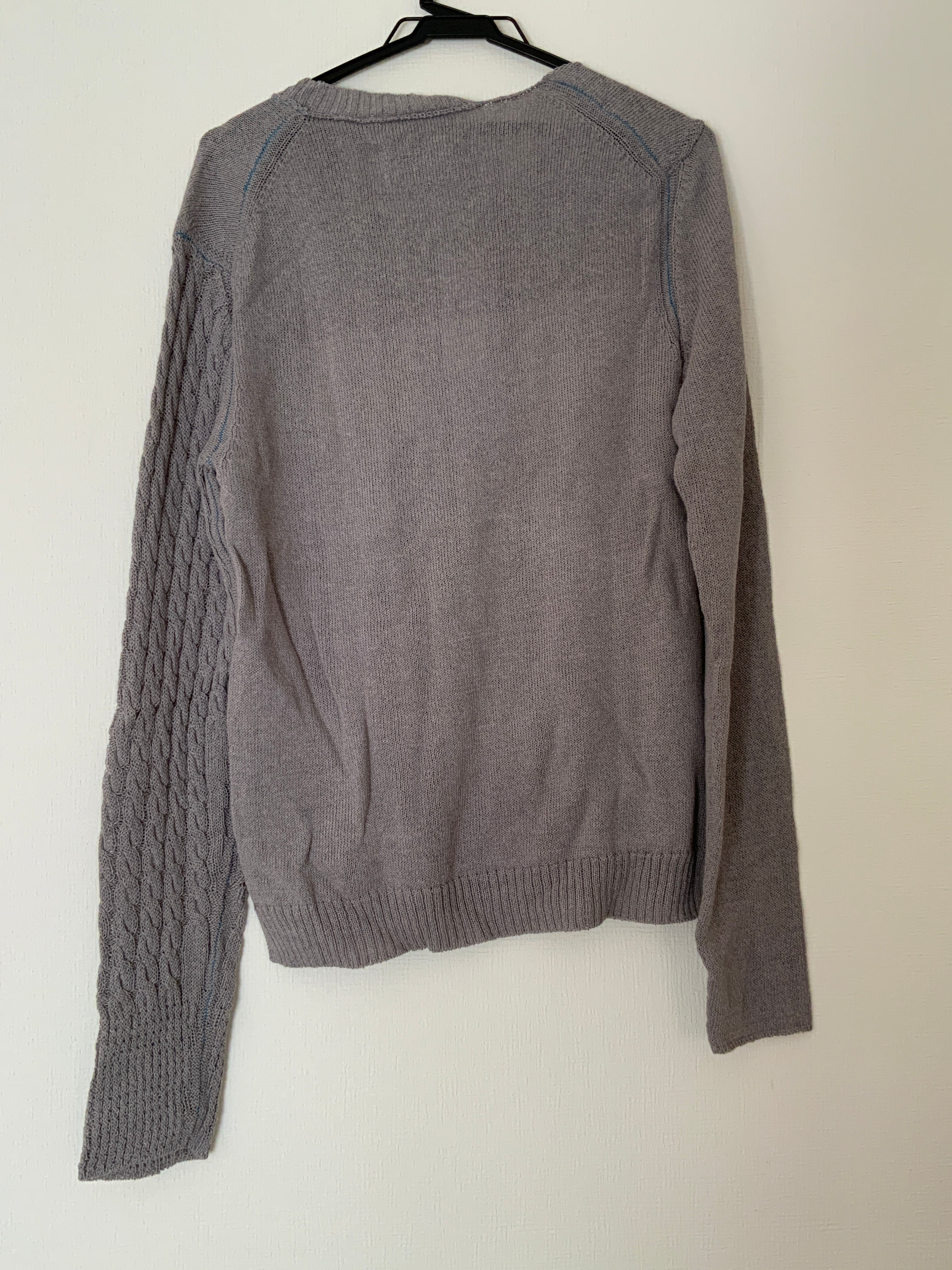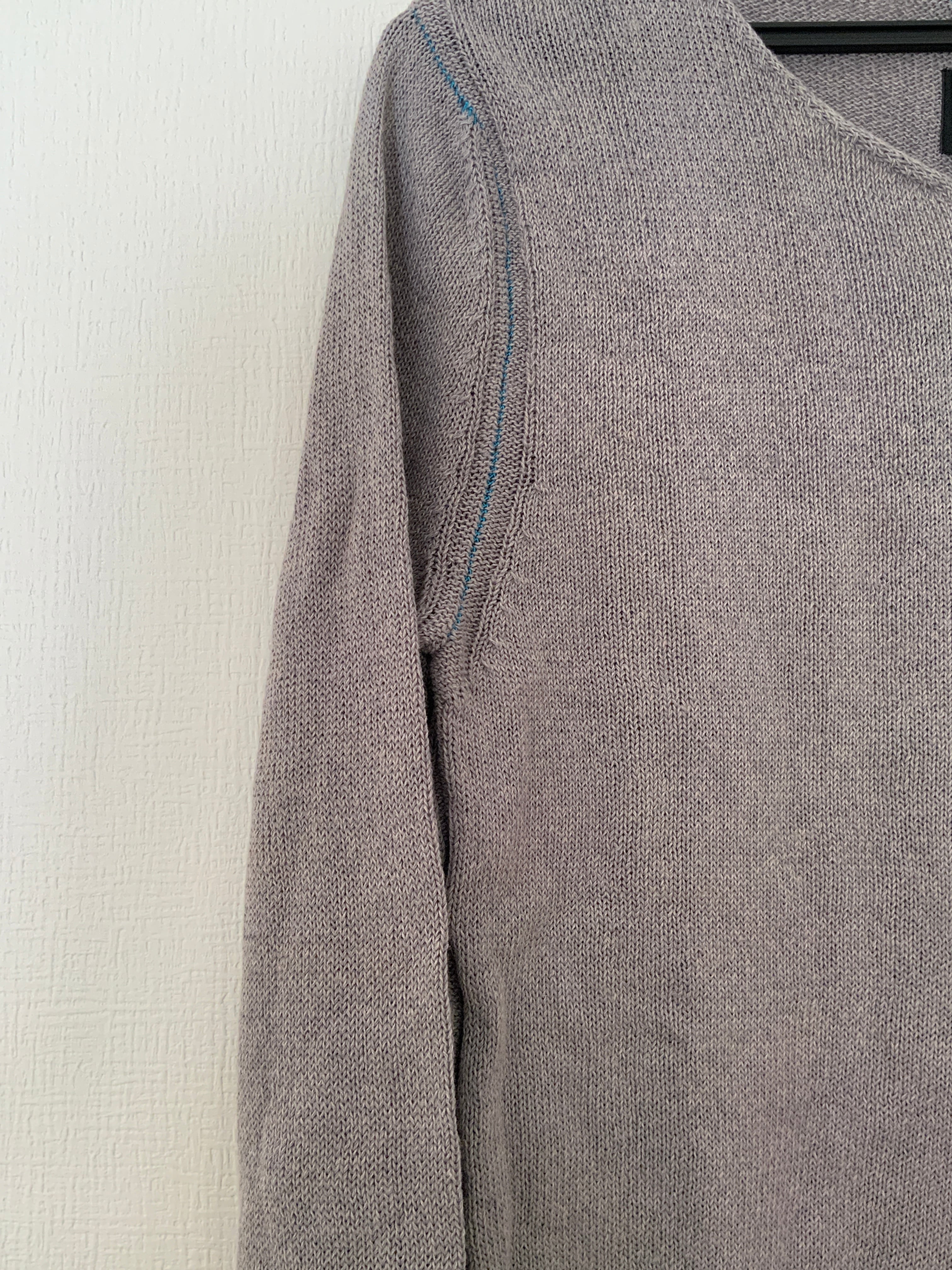 左右の袖で編み方を変えたり、首のリブを半分にしたり、脇や袖、肩などのステッチをターコイズブルーにした、春から使えるニットです。