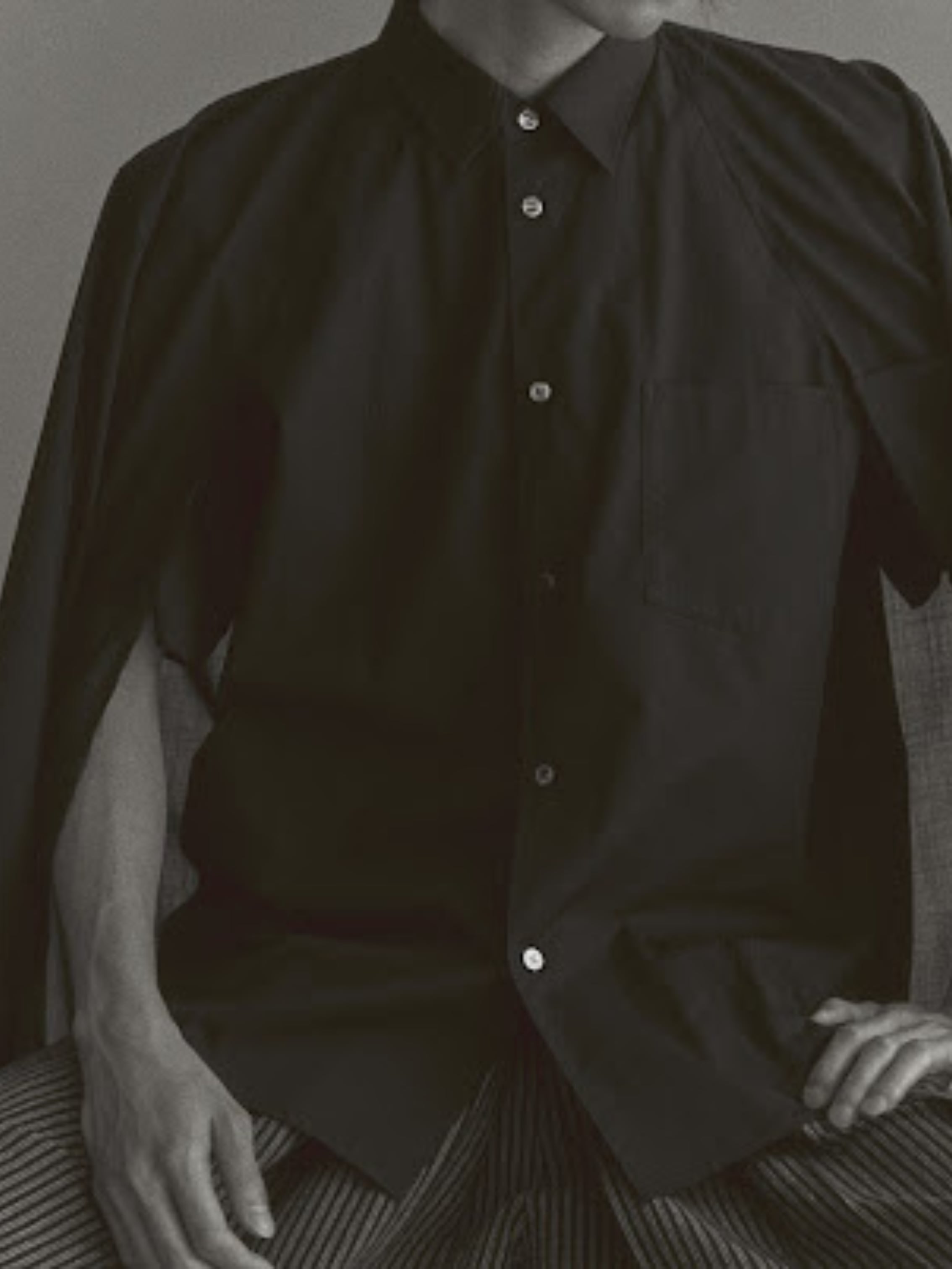 "薄手のウールポリエステルを使用した長袖シャツと、コットン素材の半袖シャツをレイヤードしたデザイン。 異なる質感の生地を重ねることで、素材同士のコントラストが際立ちます。 長袖シャツの前端をカットオフすることで、羽織のようなニュアンスも生まれ、軽やかな抜け感を演出。着方次第でシルエットや印象が変化する一着です。"