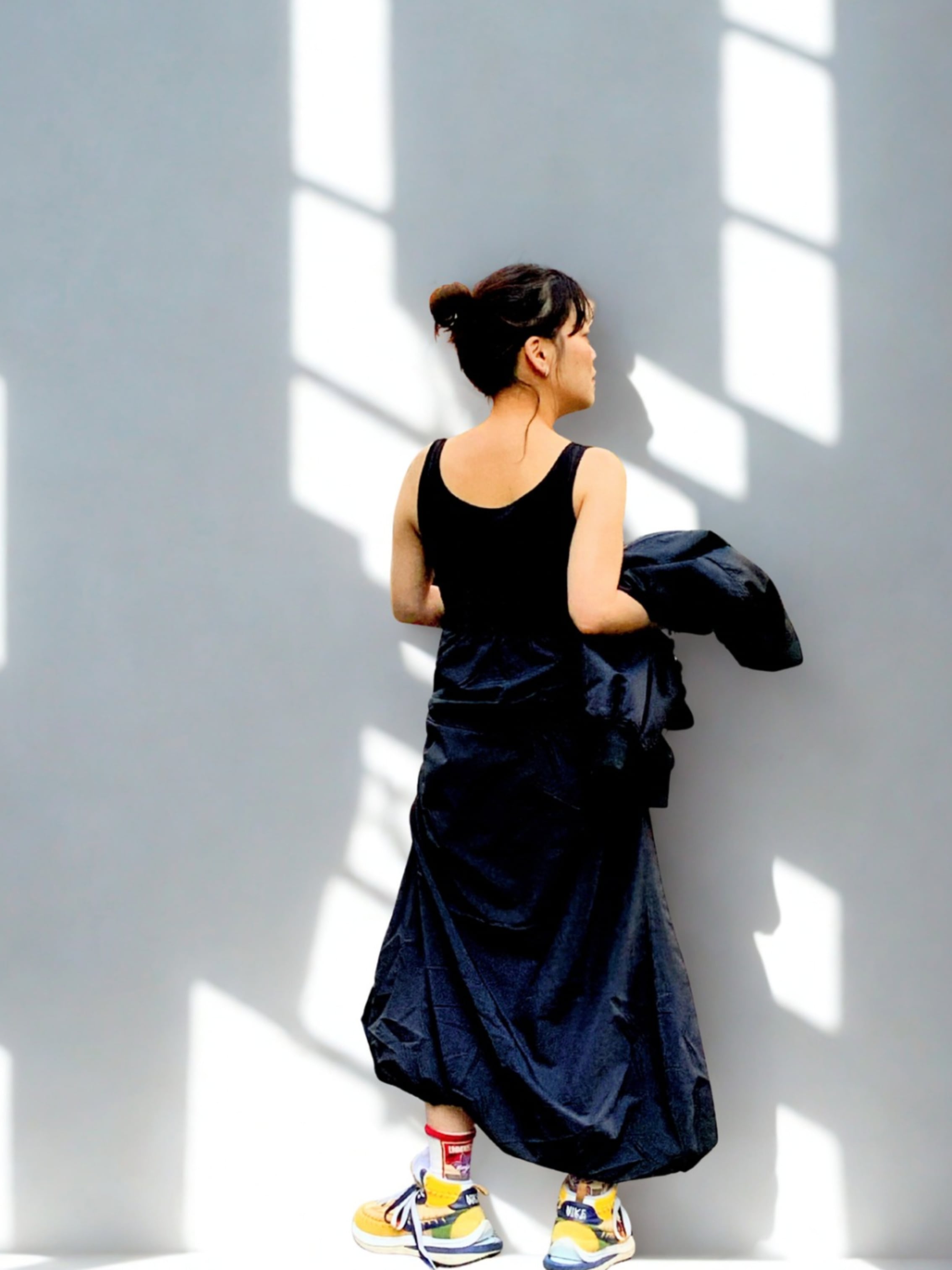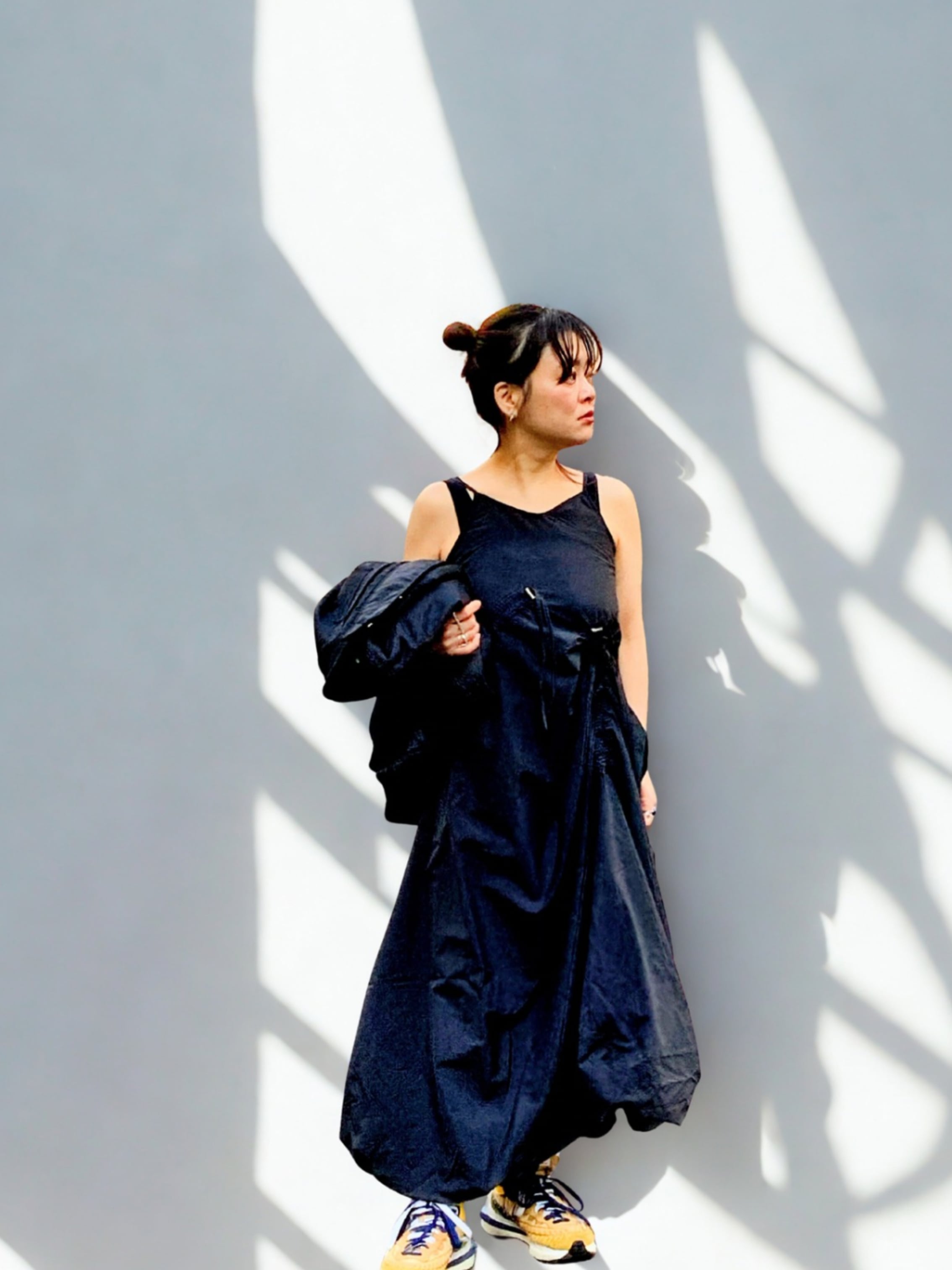 フォルムに遊びを加え、シルエットの変化を楽しめるロングワンピース。