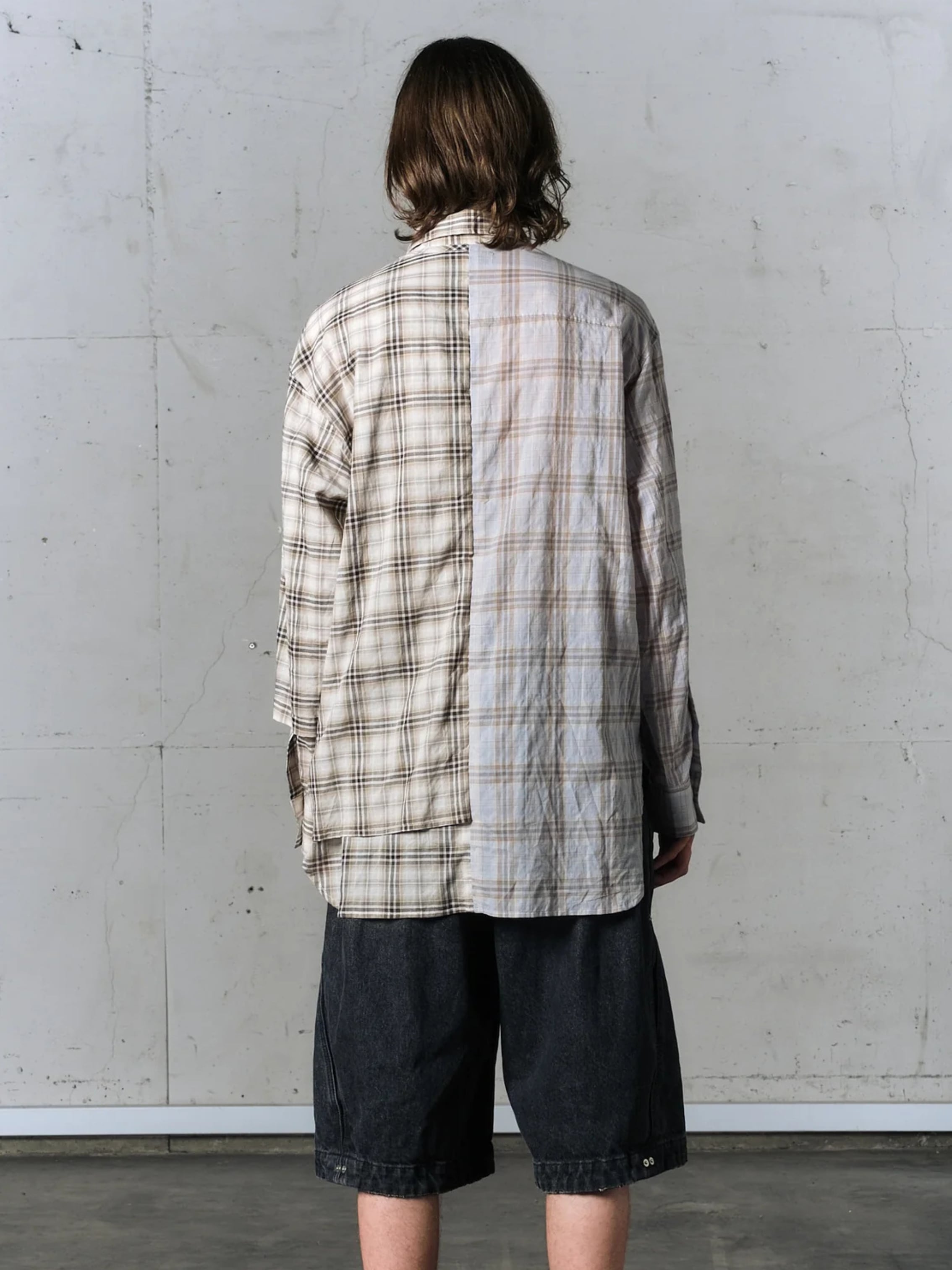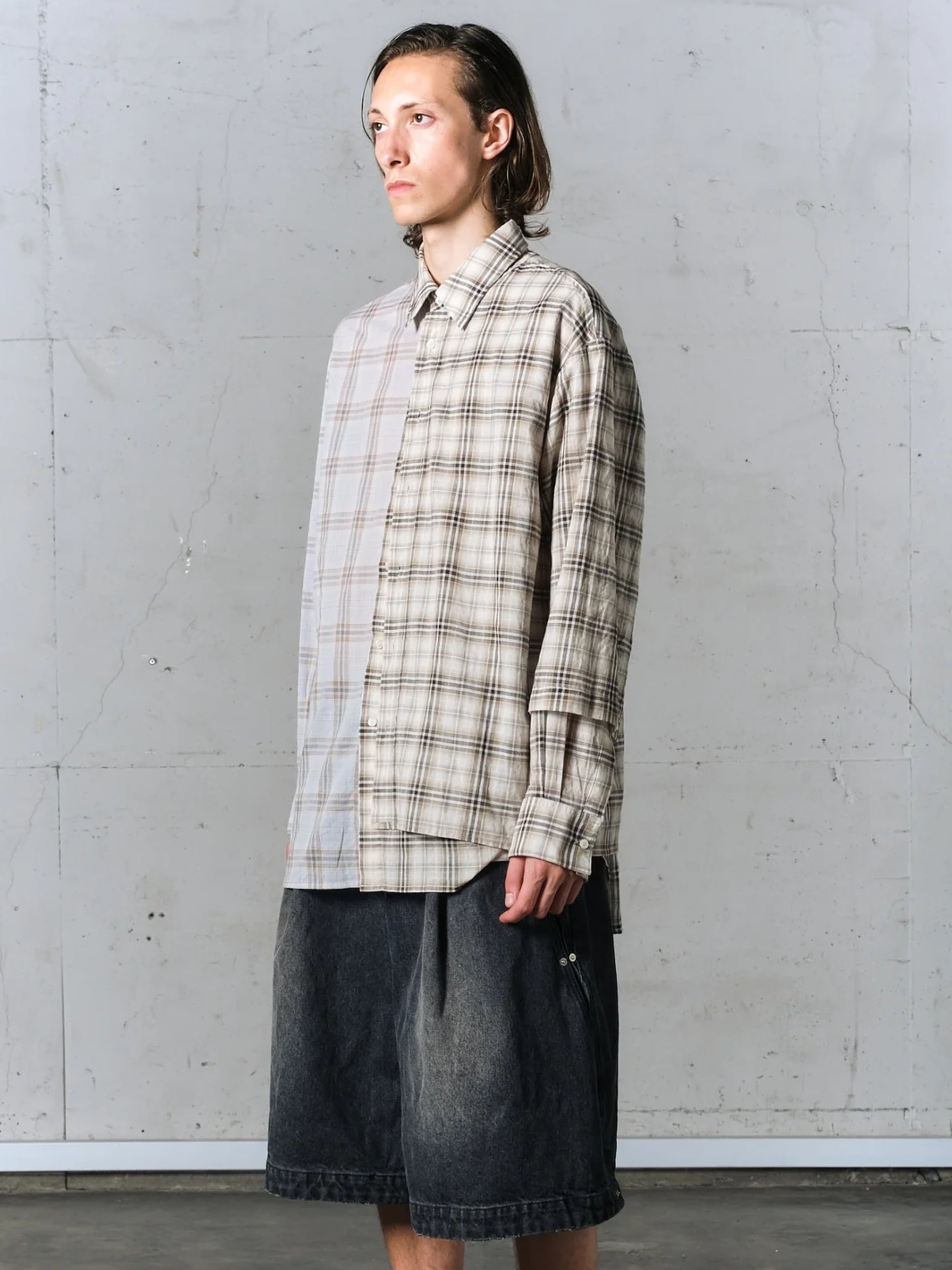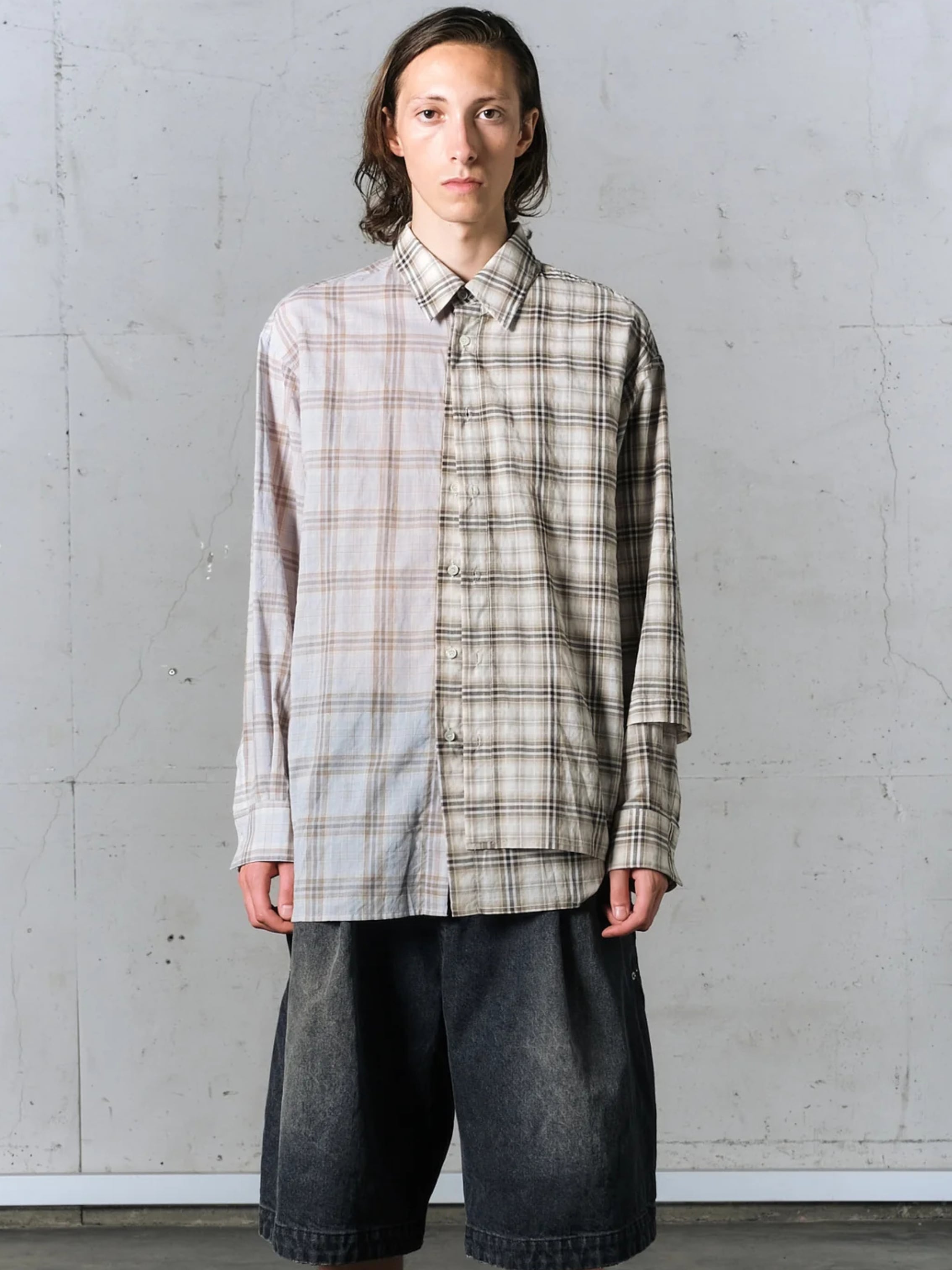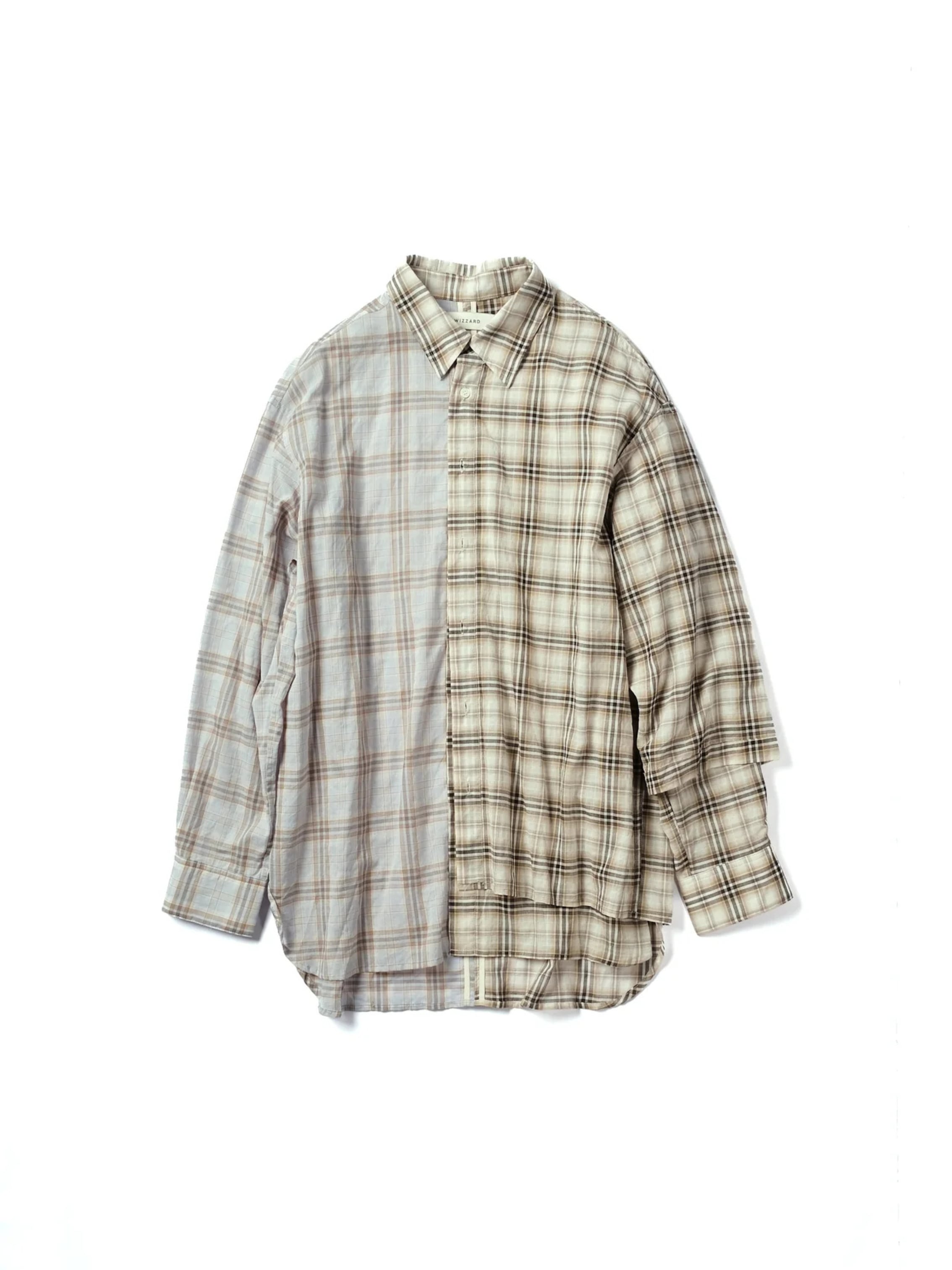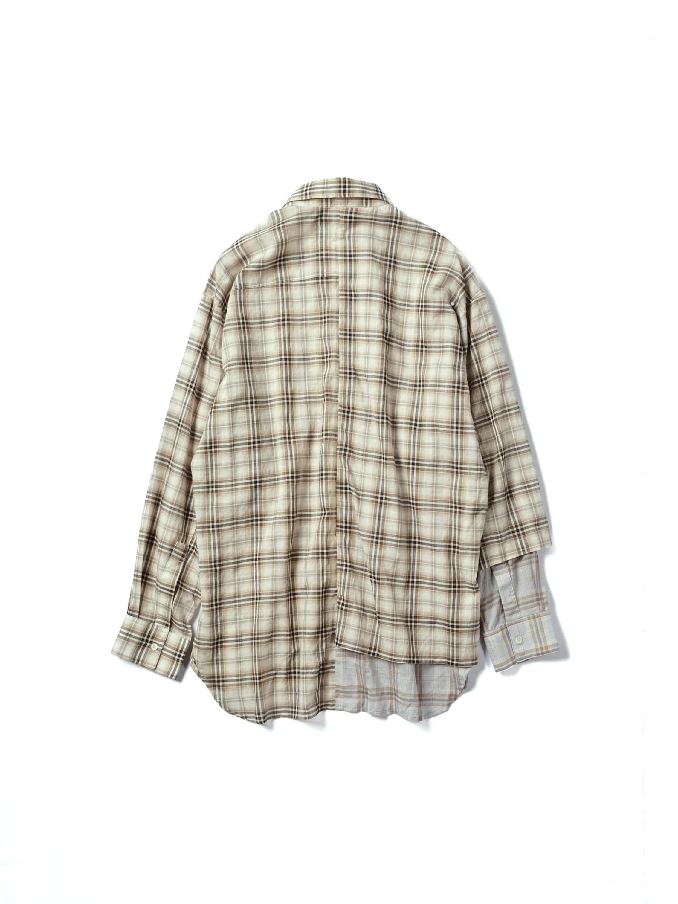 半身にレイヤードを施したアシンメトリーデザインのシャツ。
