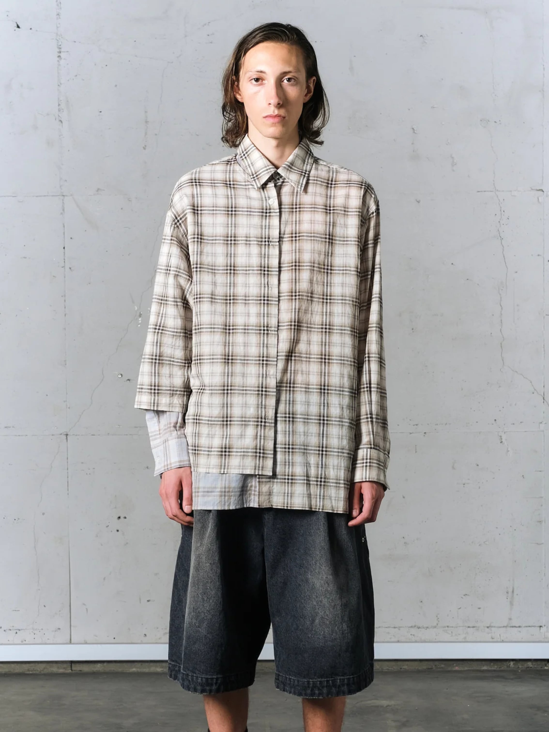 ドッキングフリップシャツ ベージュチェック×ライトブルーチェック