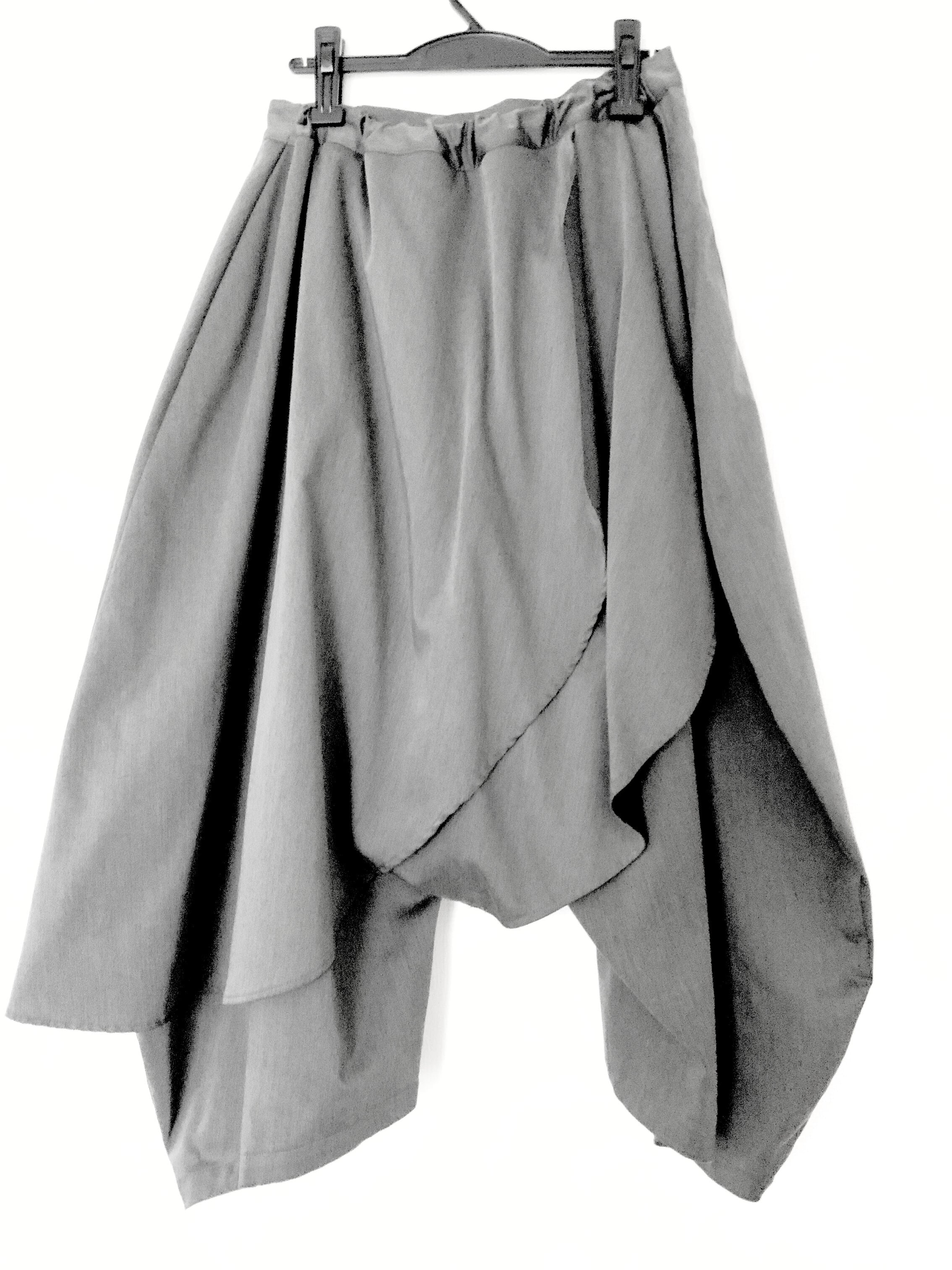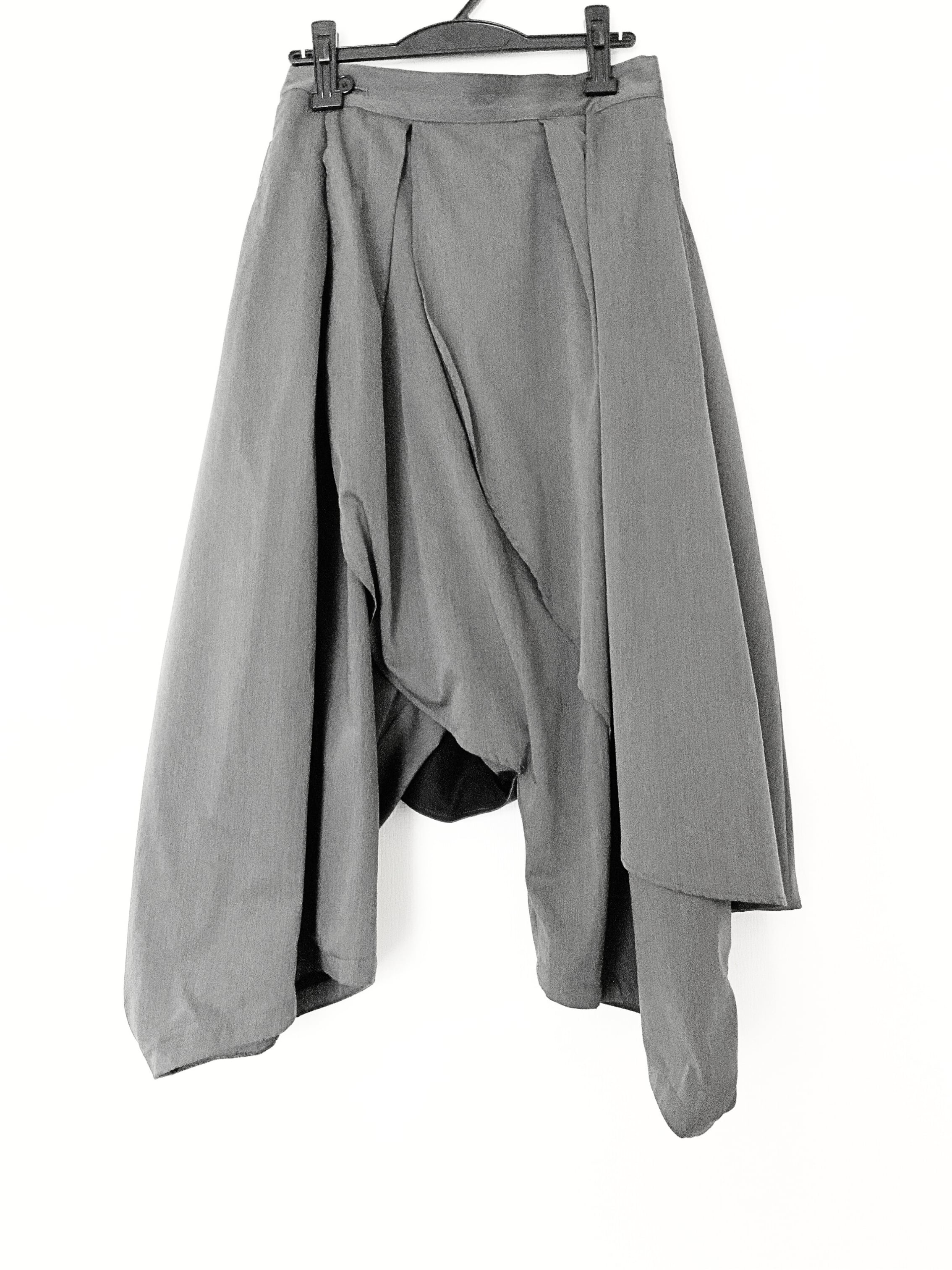 ゆったりした股上にフレアを前見頃後見頃に2枚重ねて斜めに流れるように表現したパンツ。