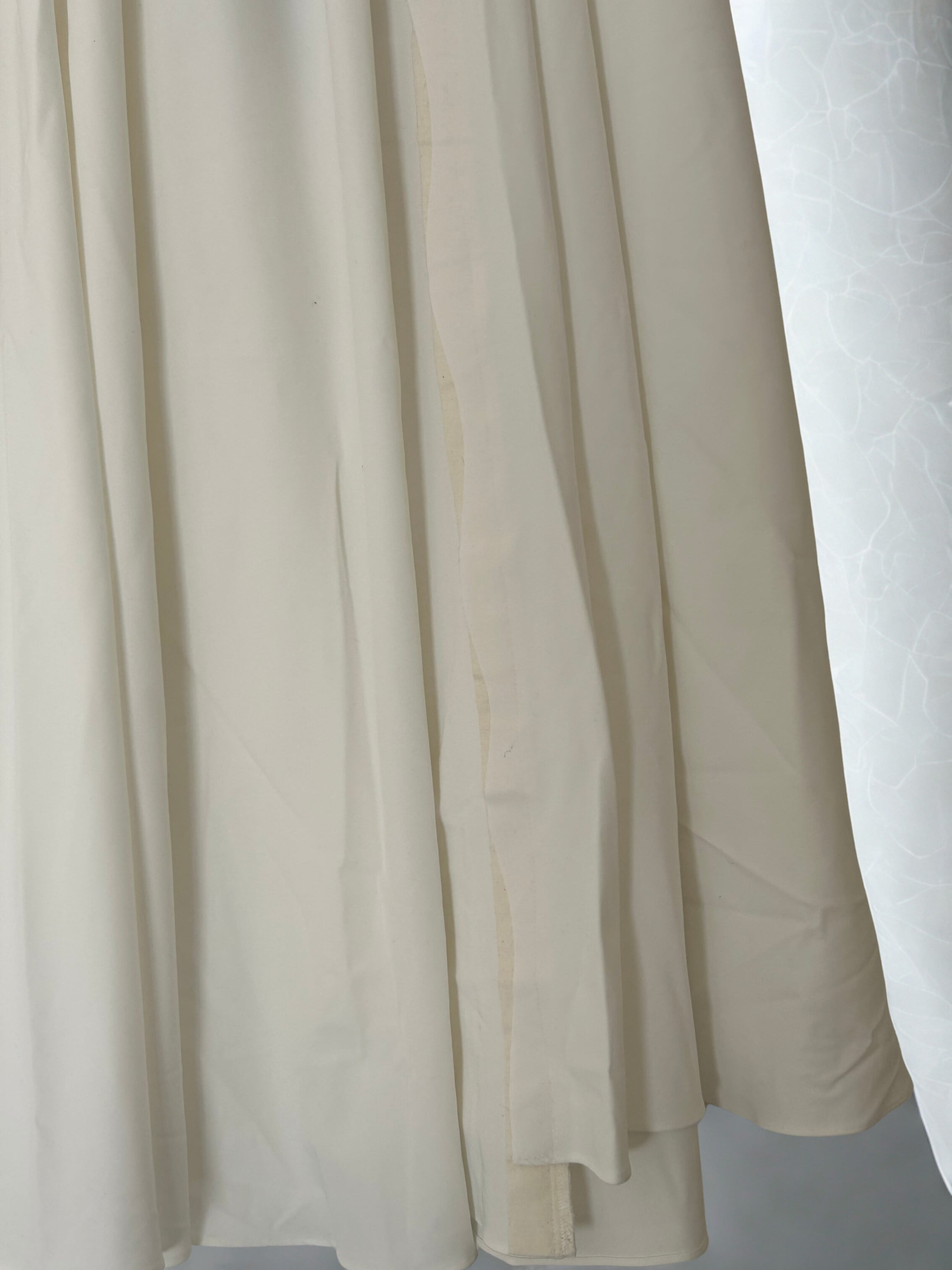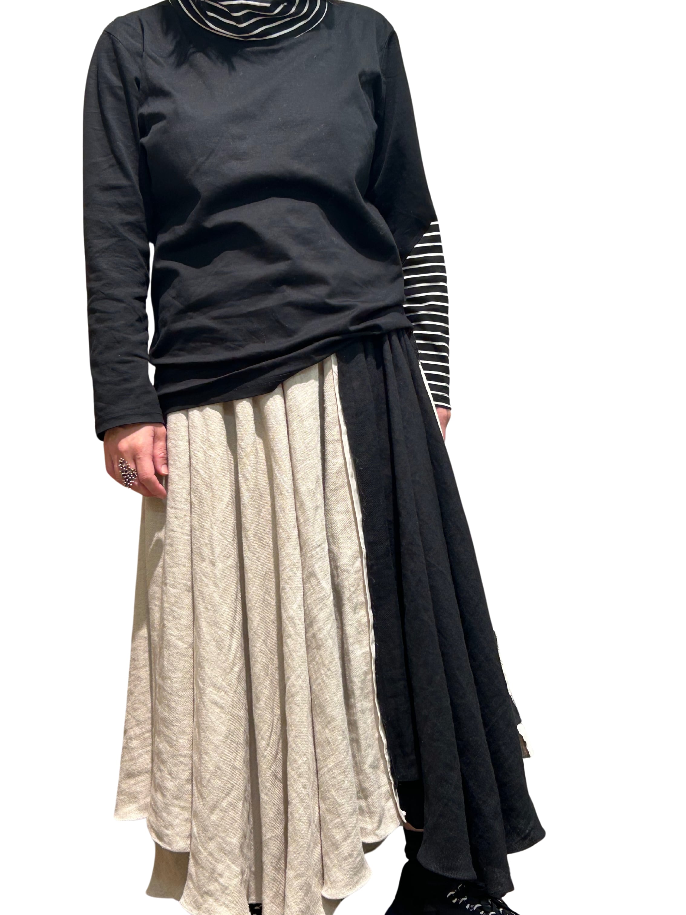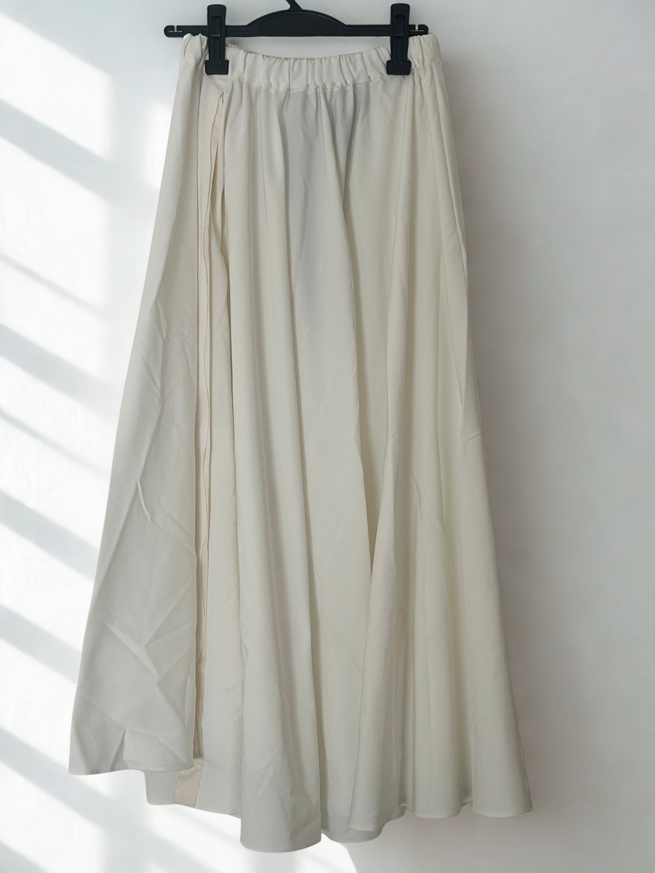 この素材はスケ防止加工が施されているのと同時に、スカートの用尺を4m使って作っているので透ける心配もあまり気にしなくて良いのと、とても雰囲気が出てトップスはTシャツでも決まるスカートのデザインになっています。