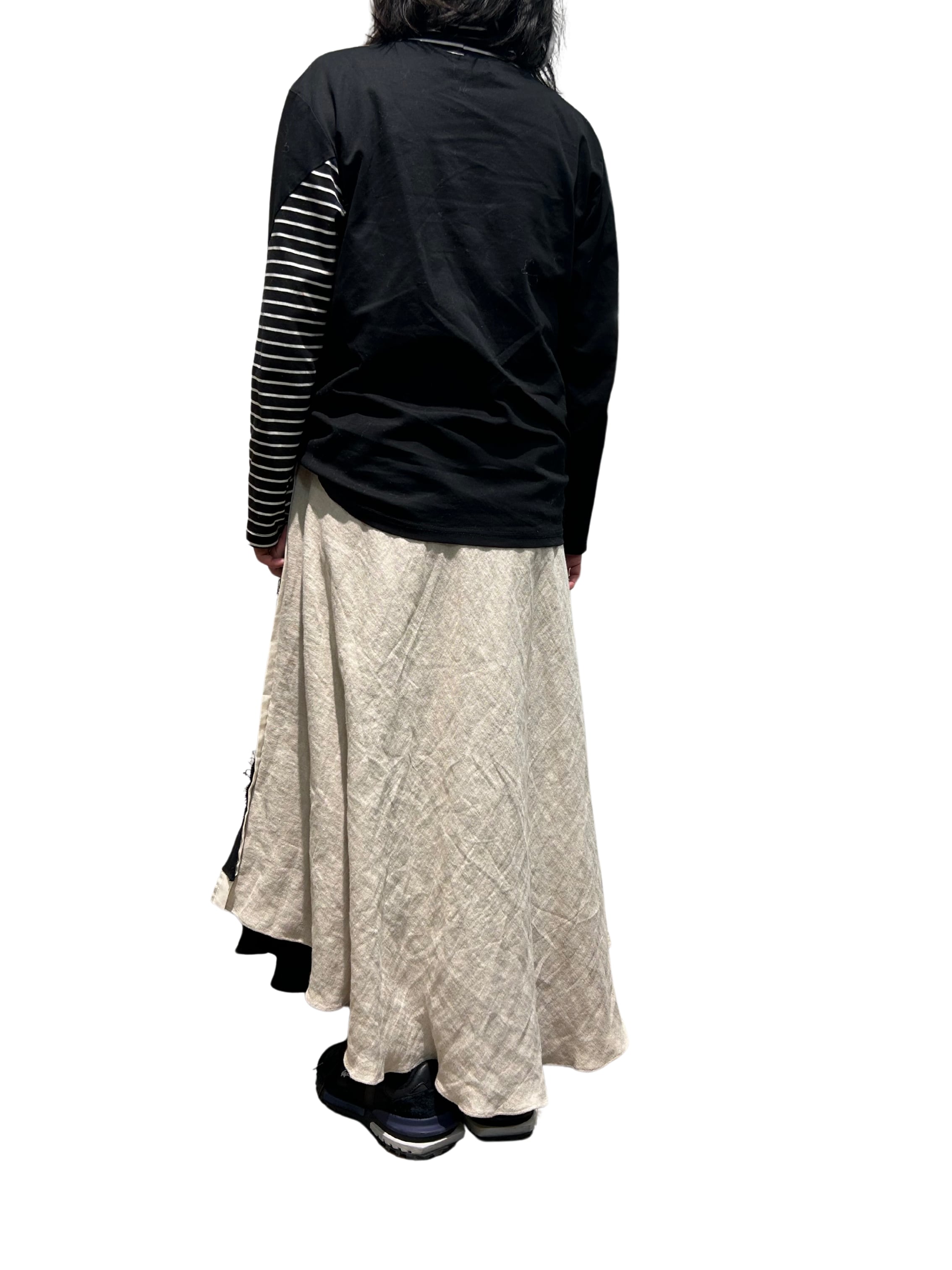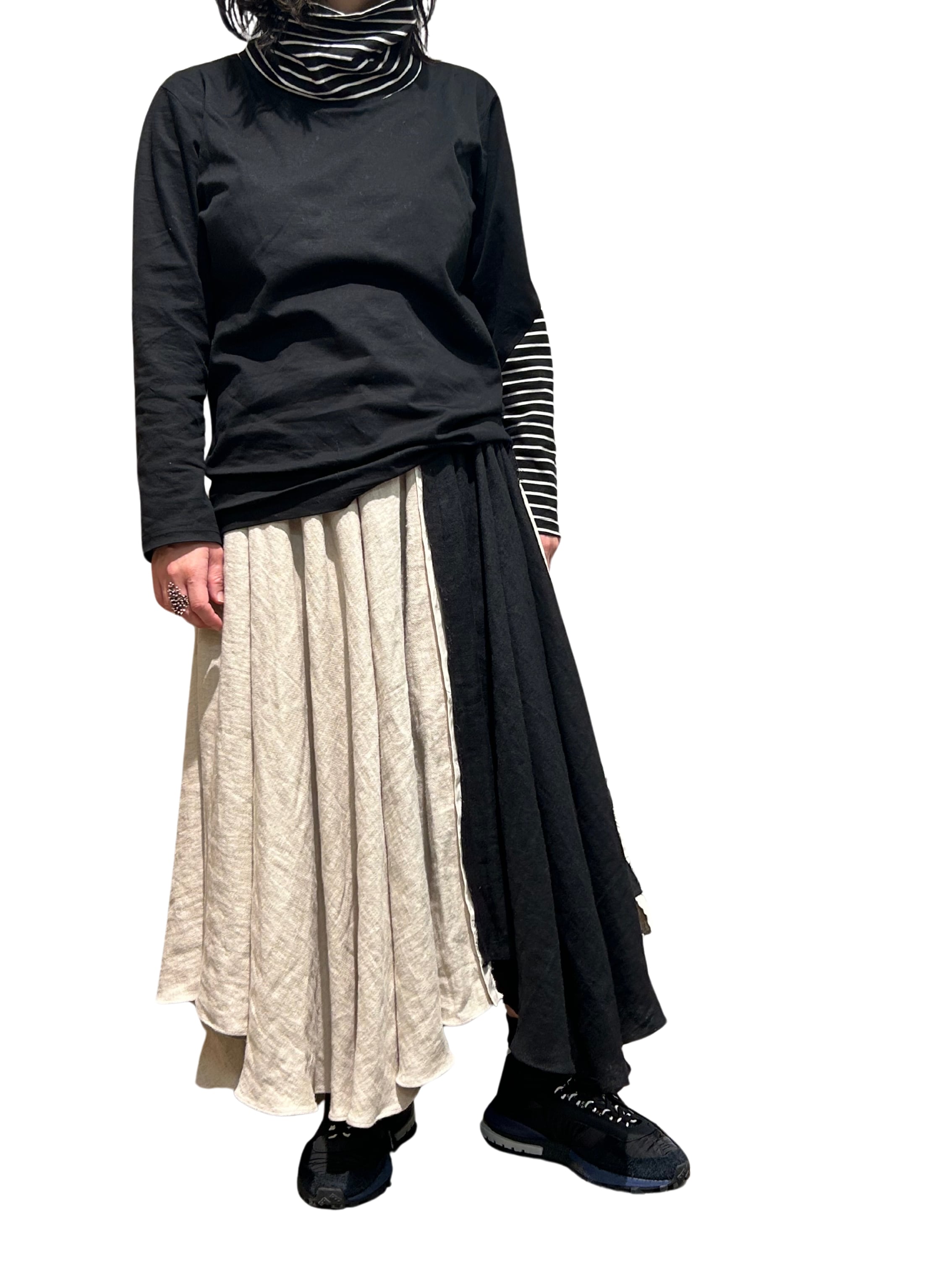 丈の長さもアシンメトリーで楽しめる1枚です。