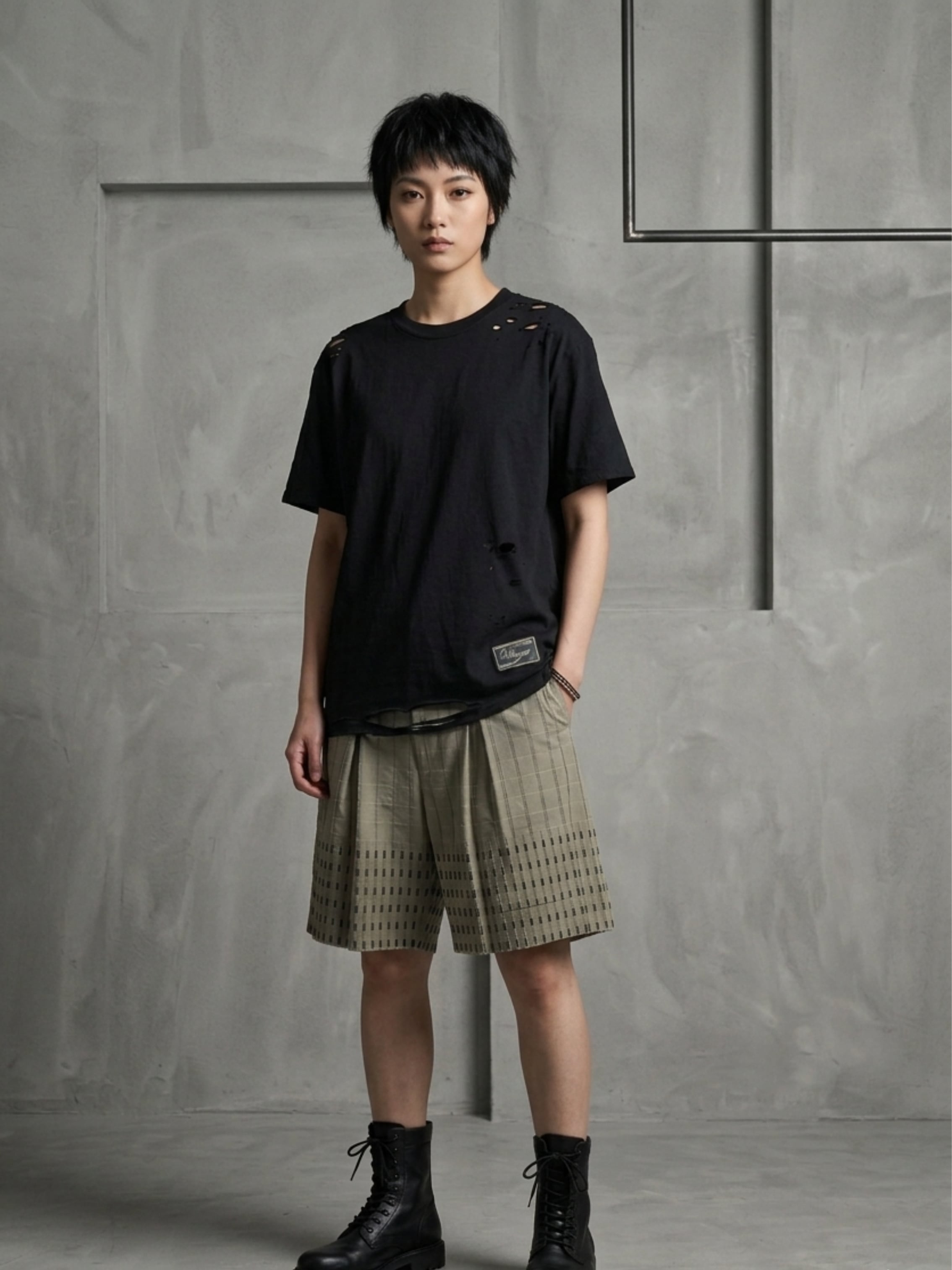 ハードなダメージ加工とステンシルプリントが印象的な一着です。