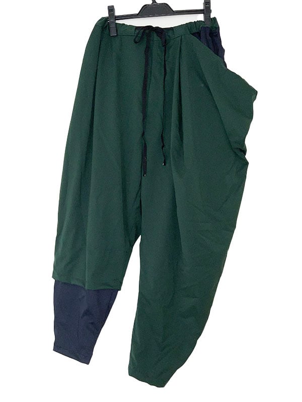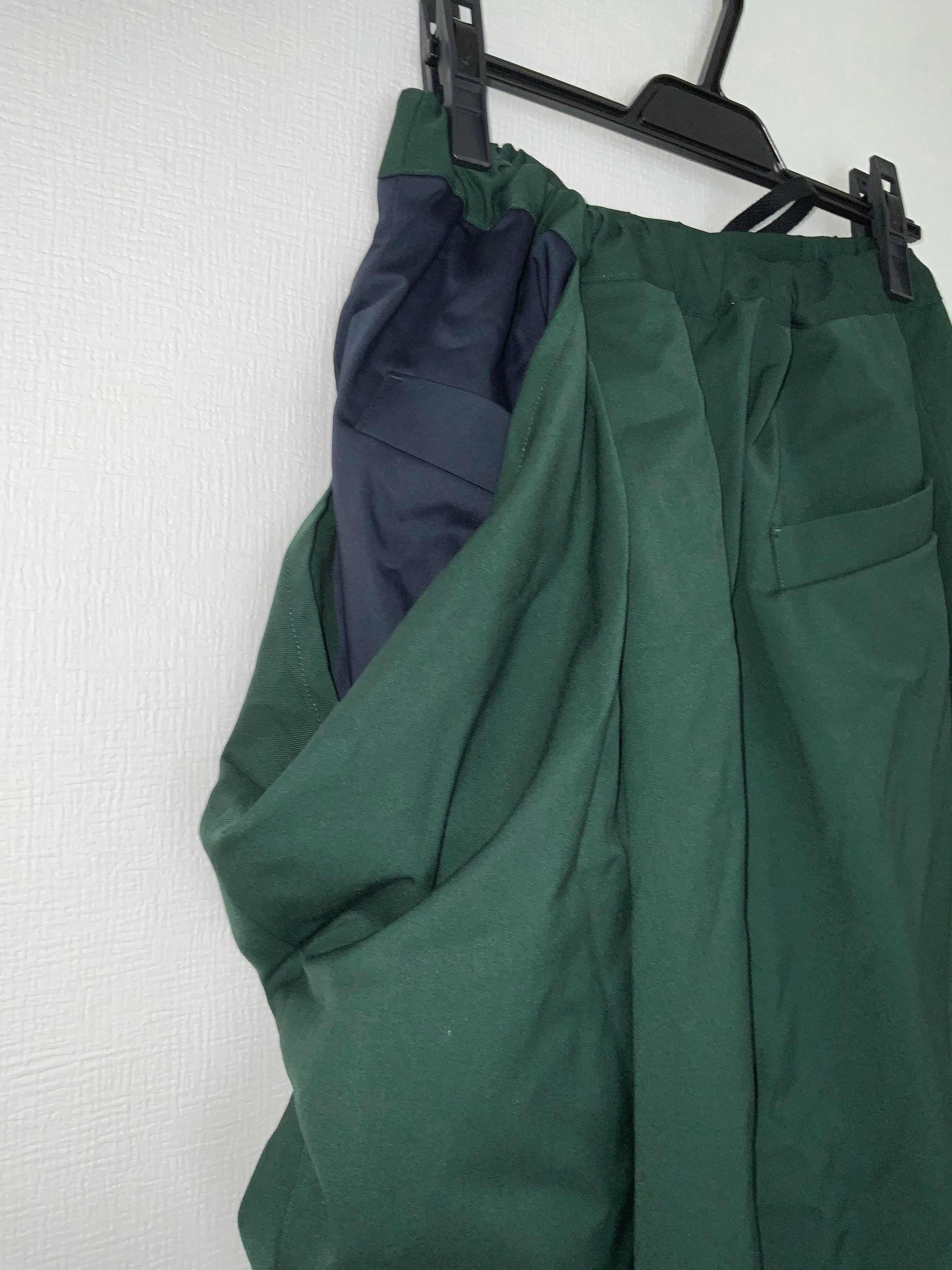 光沢のあるウール混の素材を使用しカジュアルすぎないパンを表現。左足のポケット付近を二重のデザインにし異素材を見せる事でアクセントを作り出し、右足の裾も異素材を見せる事で変化を表現。