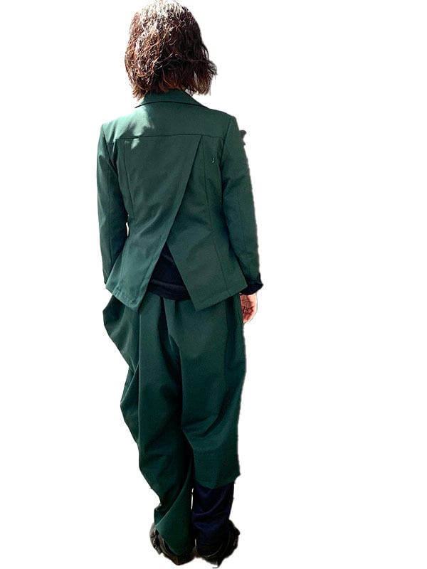一見カチッとしたジャケットだが、よく見ると見頃が異素材で二重になっており、また後ろのデザインも二重で被せにしてあるのでかなり動きがつく一品になっています。