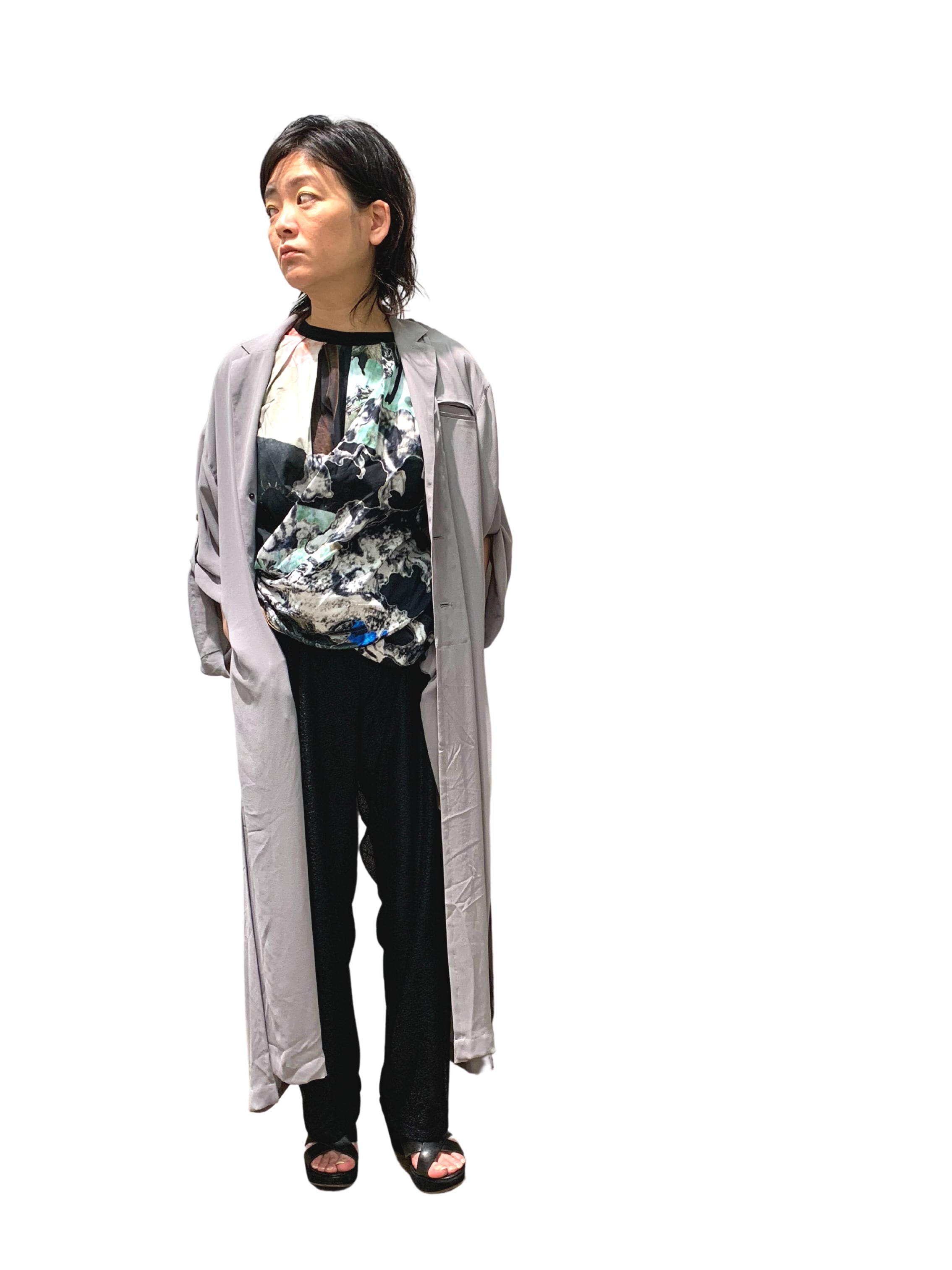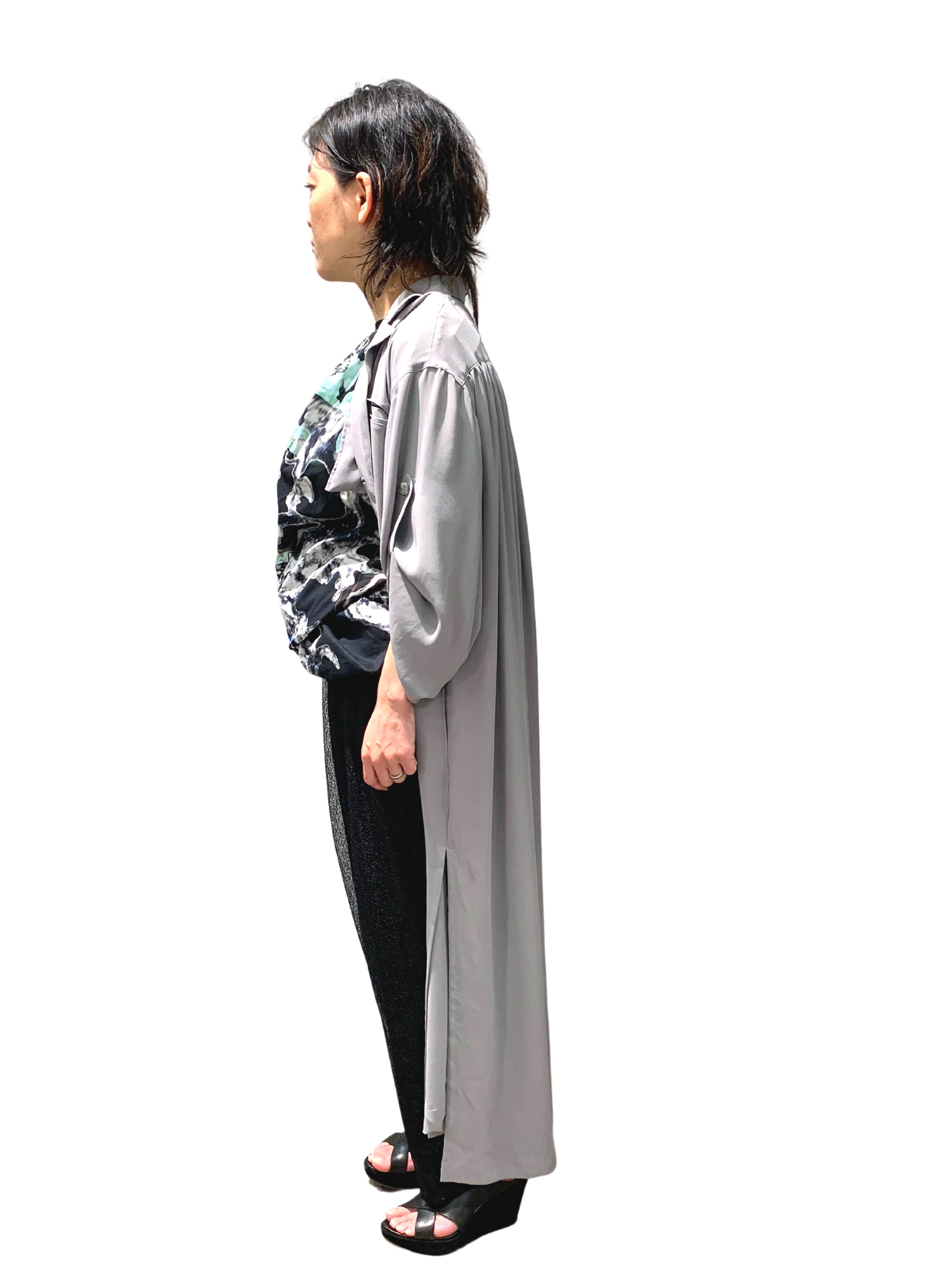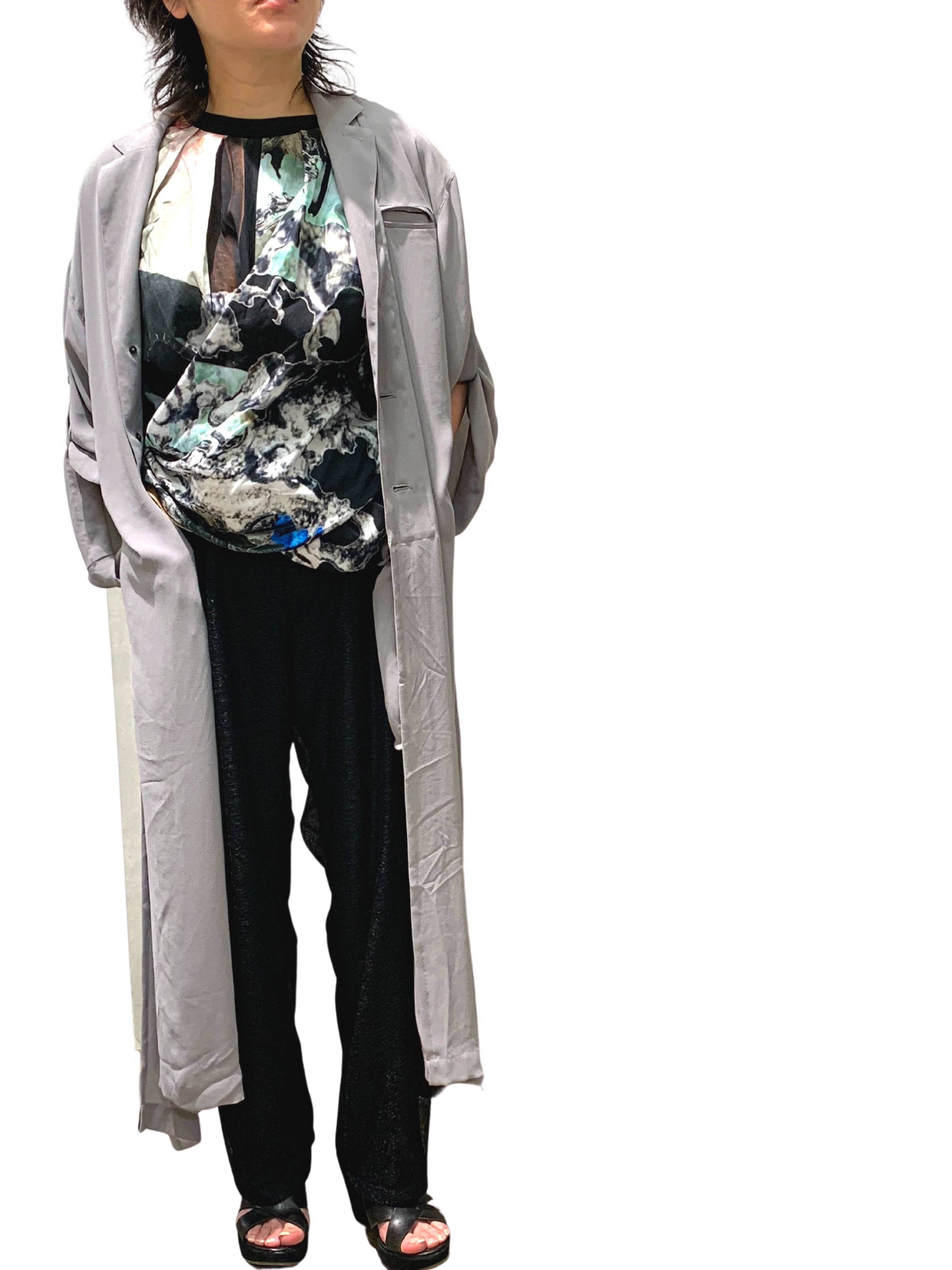 男性のジャケットの無骨さと女性特有のラインの綺麗さ・ドレープの綺麗さをミックスさせたロングジャケット。
